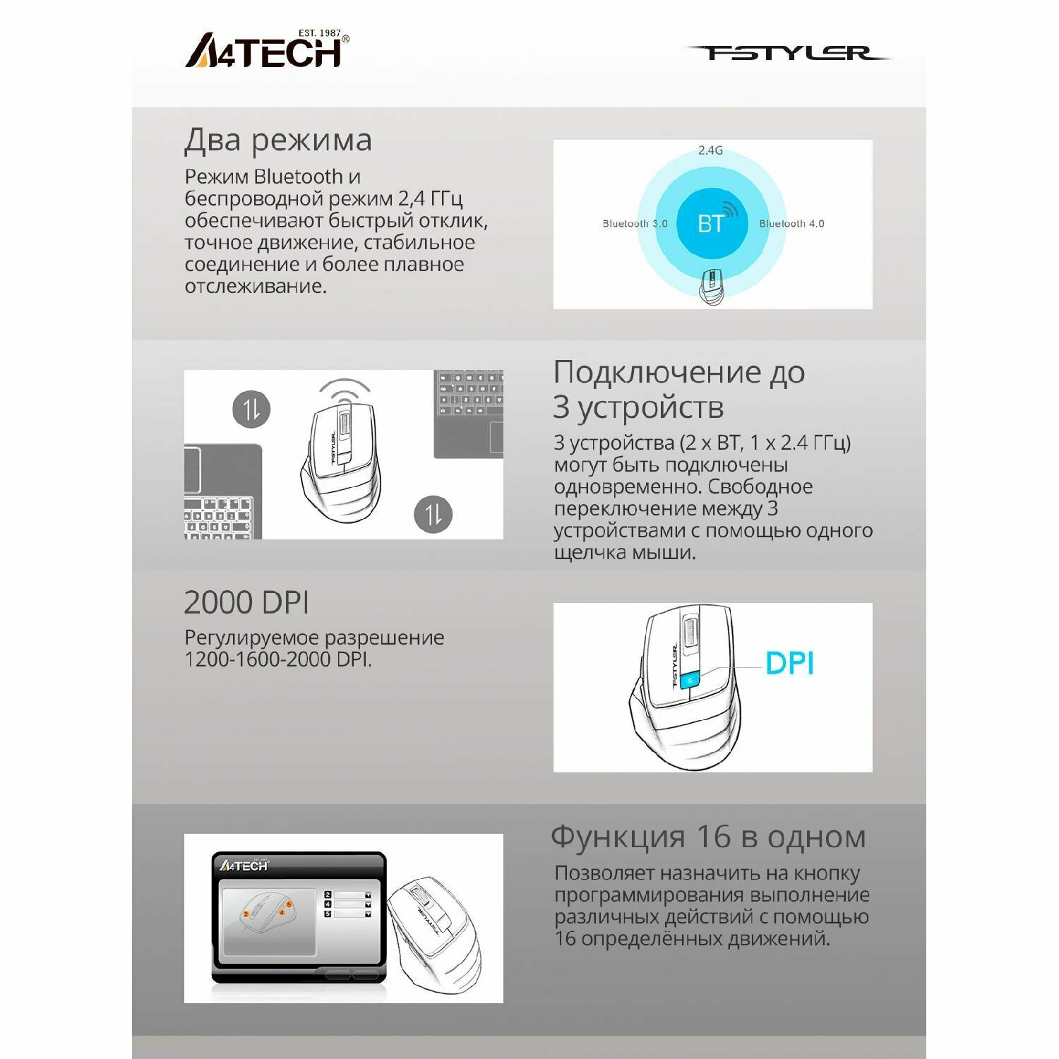 Беспроводная оптическая мышь A4Tech Fstyler FB35, 1200-1600-2000 DPI, 6 кнопок