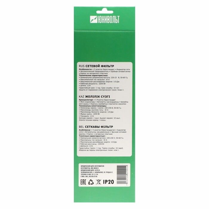 Купить Сетевой фильтр Юнивольт, 5 гнезд, 1.5 м, 10 А, 2200 Вт, с з/к, белый