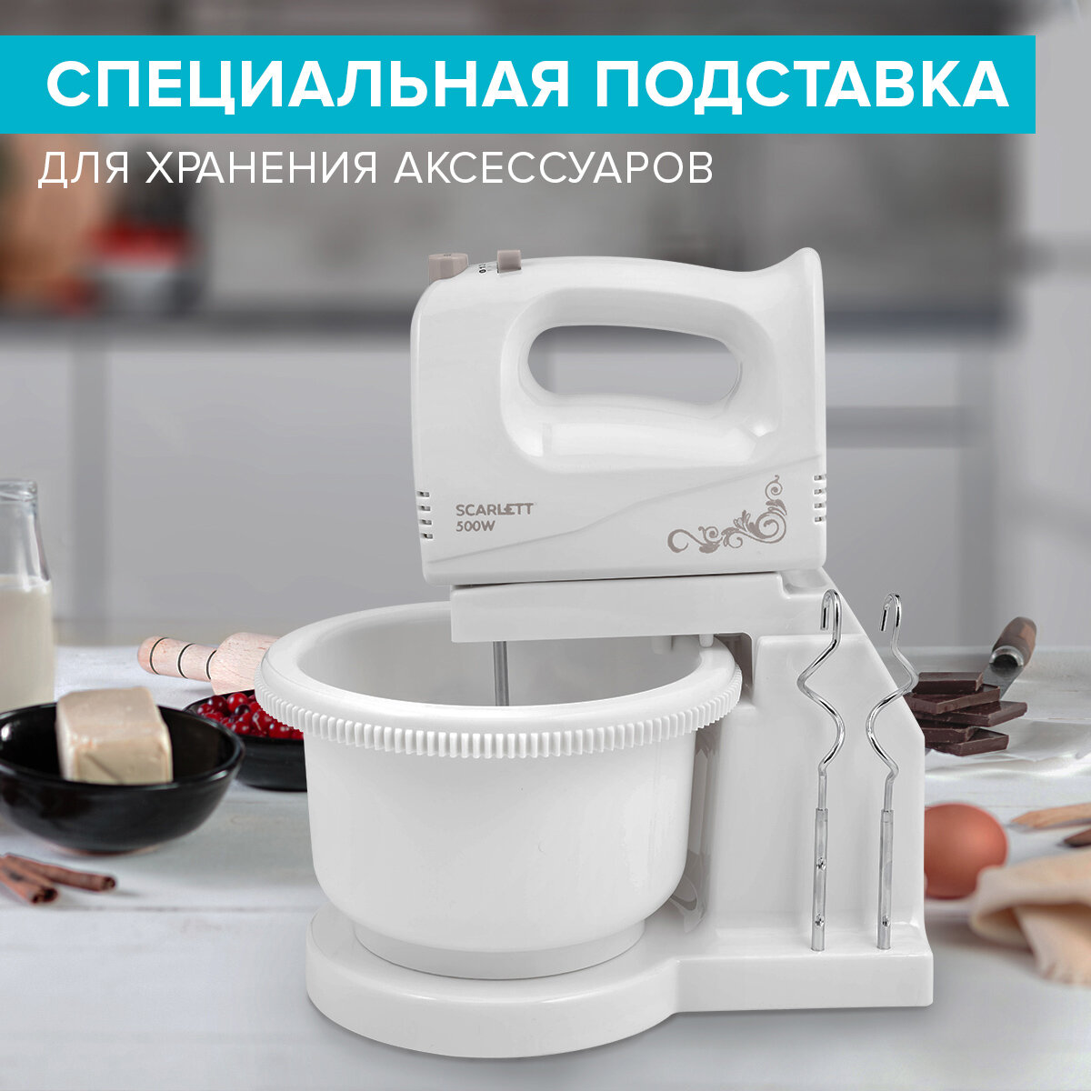 Миксер SCARLETT SC-HM40B03 на подставке 500 Вт, 5 скоростей, 2 венчика, 2 крюка для теста, чаша, белый