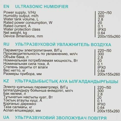 | Тип увлажнителя | ультразвуковой |