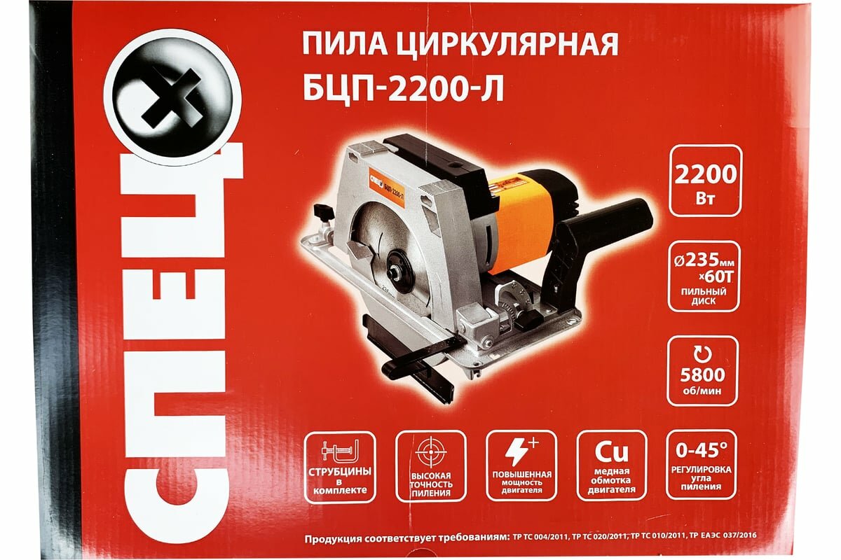 Пила циркулярная спец БЦП-2200-Л, 2200Вт 235мм, стальная подошва, комплект струбцин , цв коробка спец (СПЕЦ-3423)