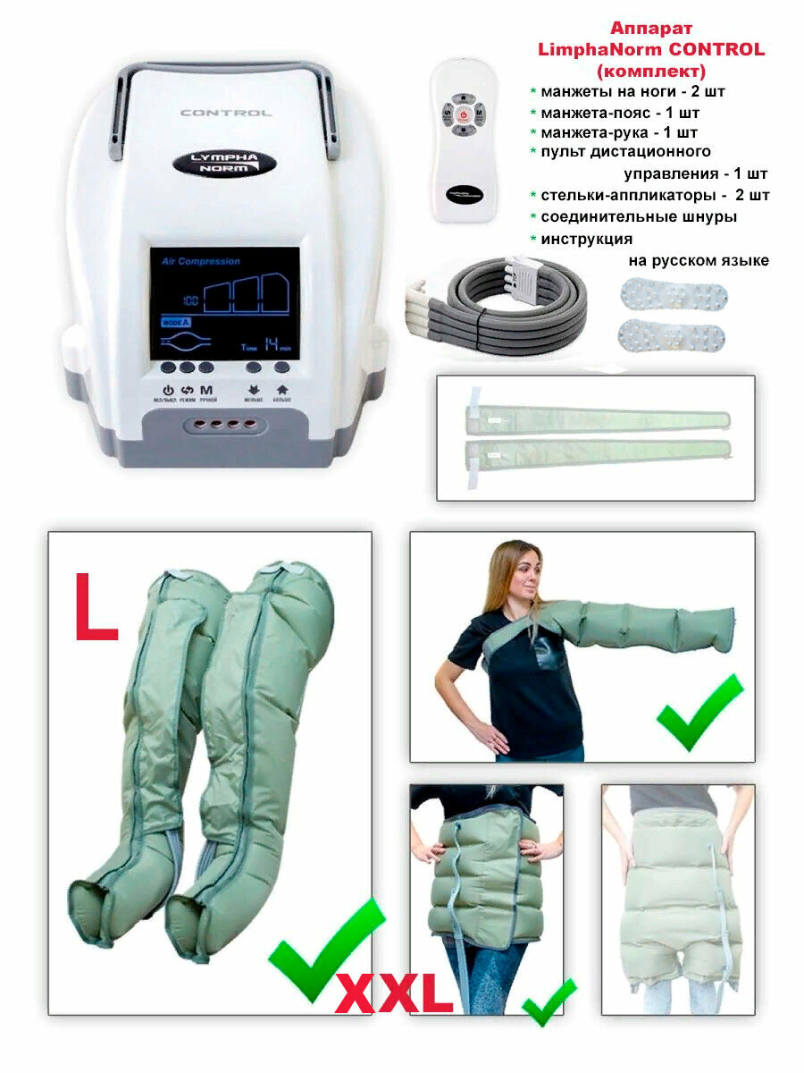 Лимфодренажный массажер CONTROL LymphaNorm : 2 манжеты для ног L + 1 манжета-пояс XL + 1 манжета для руки. Профессиональный массажер для лимфодренажа и прессотерапии для дома