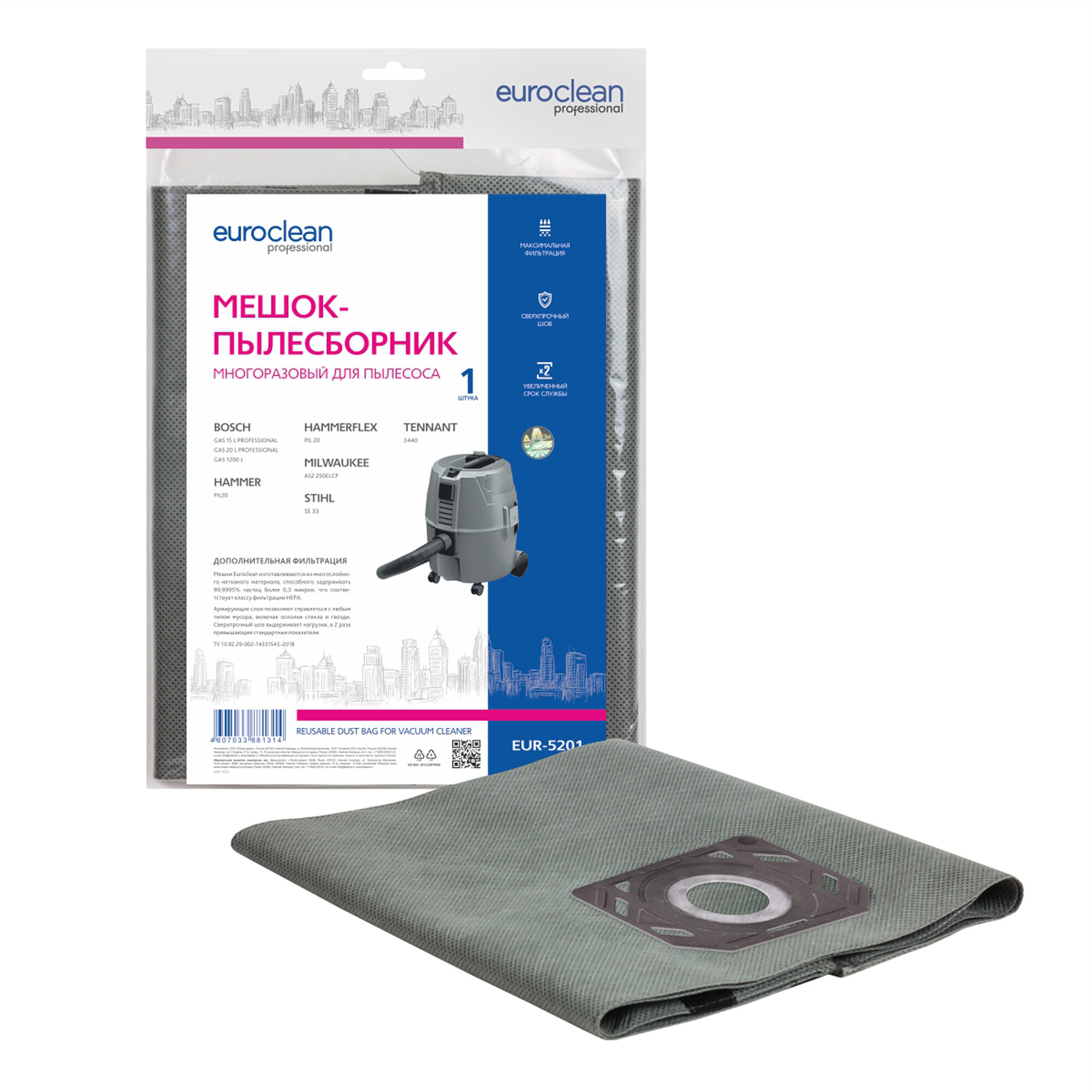 Мешок-пылесборник многоразовый с текстильной застежкой для BOSCH, HAMMER, HAMMERFLEX и др EURO Clean EUR-5201