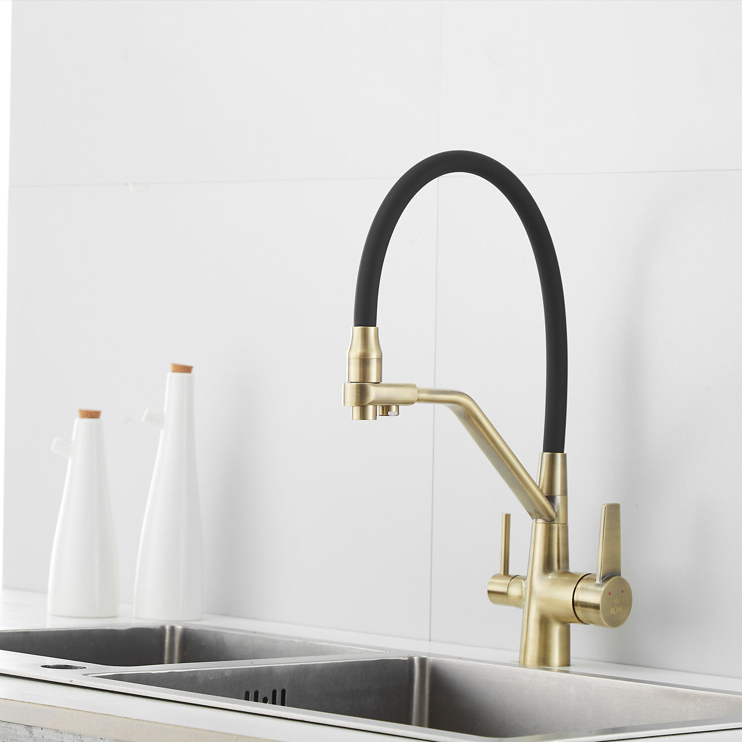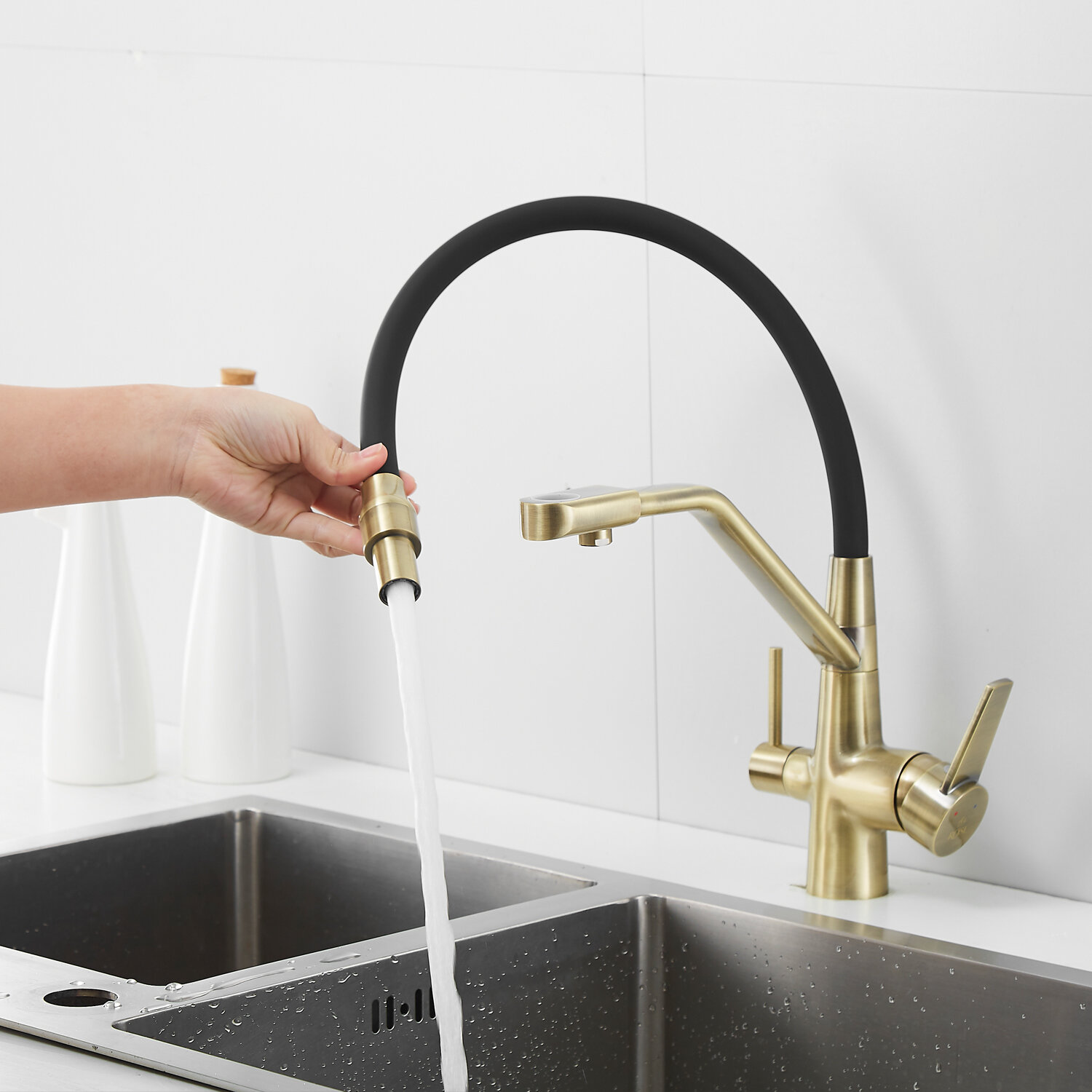 Смеситель для кухни с гибким изливом и подключением фильтра для воды Rose R558E, золото