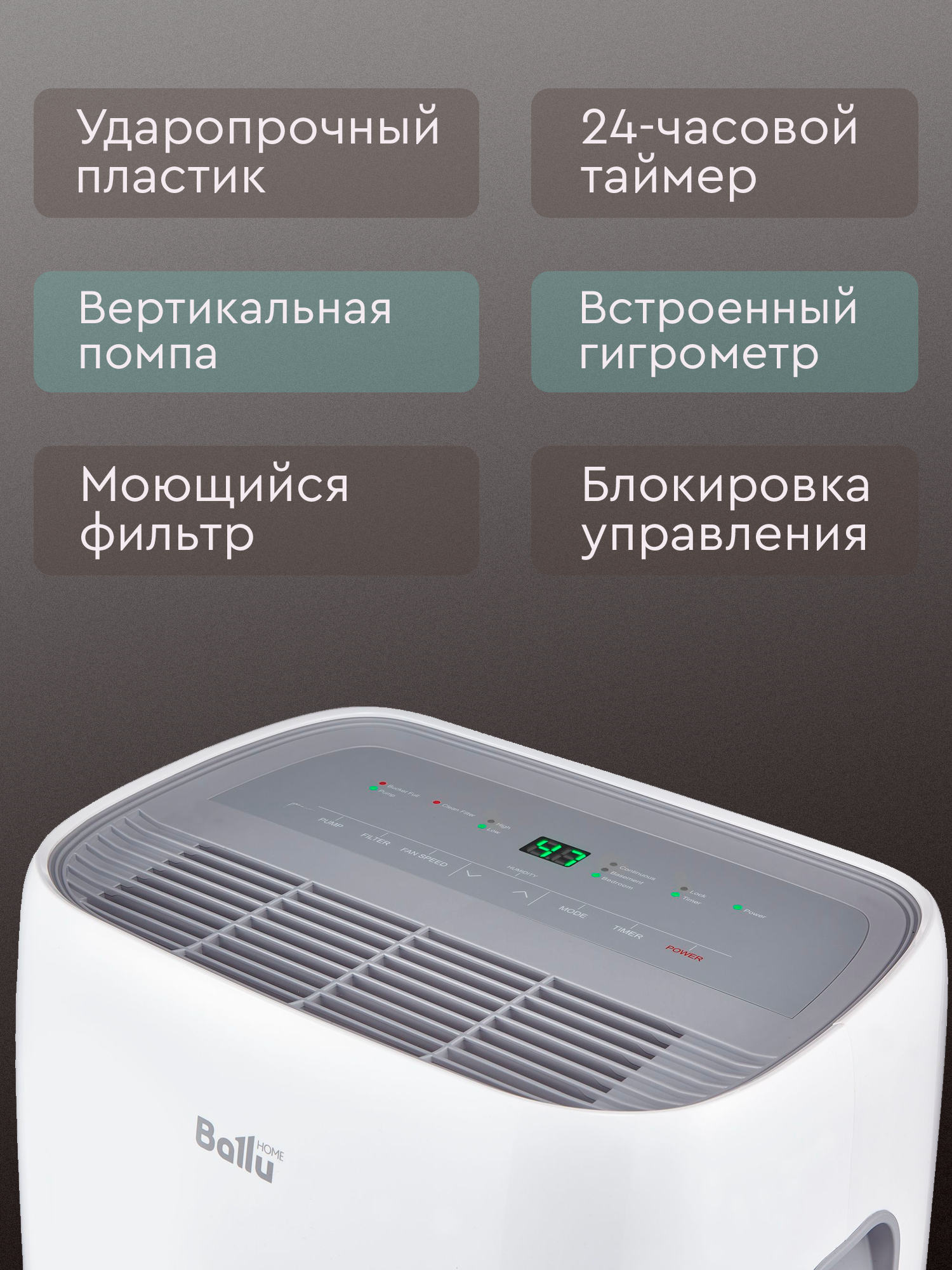 | Дополнительная информация | помпа для вертикального дренажа конденсата на высоту до 5 метров; защита от детей, функция самодиагностики; класс пылевлагозащищенности IPX; моющийся воздушный фильтр |