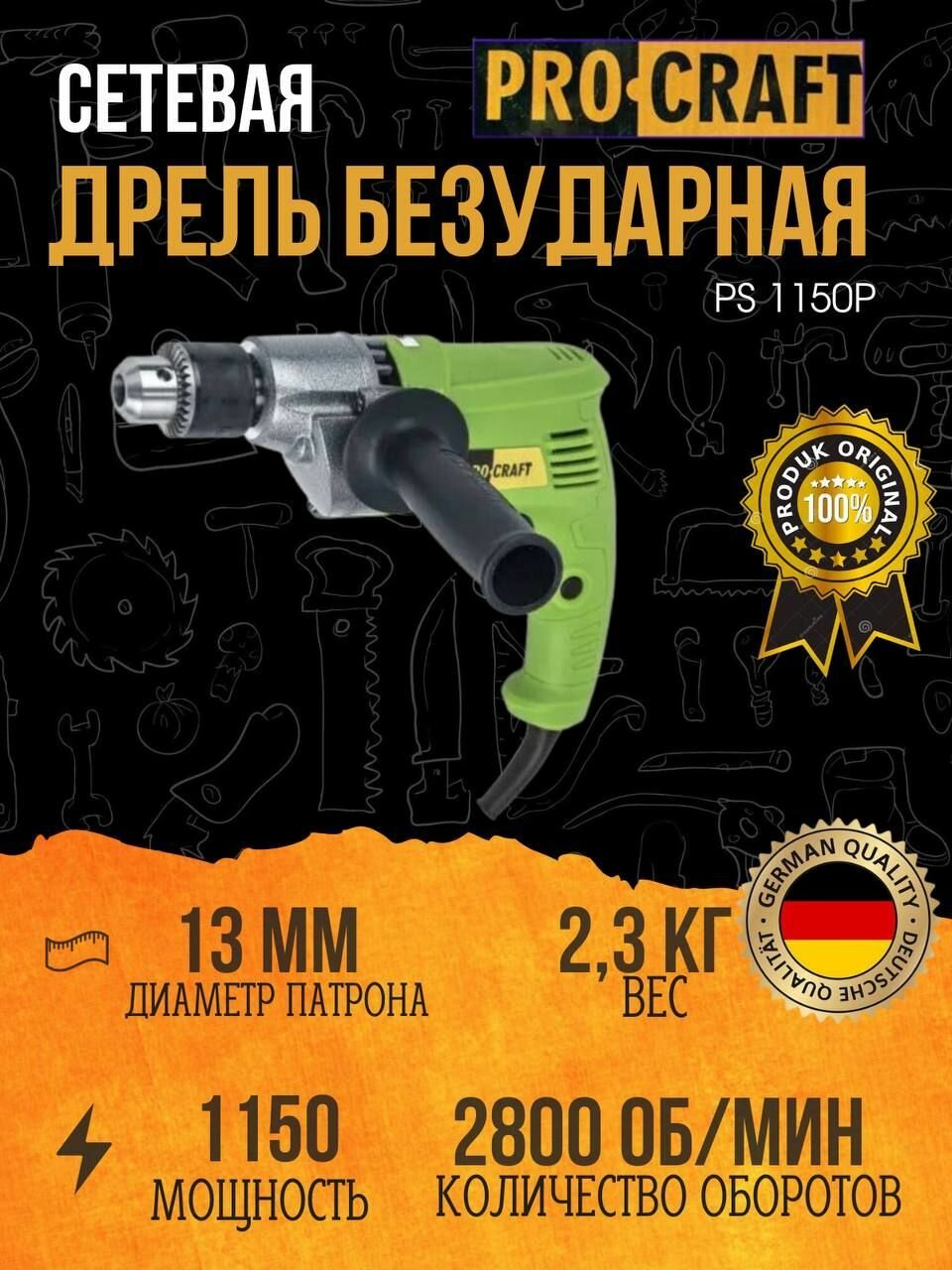 Дрель Procraft PS1150P (1200 об/мин) безударная