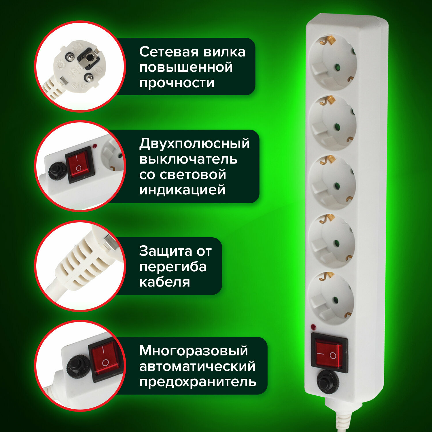 Сетевой фильтр SONNEN U-351, 5 розеток, с заземлением, выключатель, защита от перегрузок, 10 А, 1,8 м, 511424