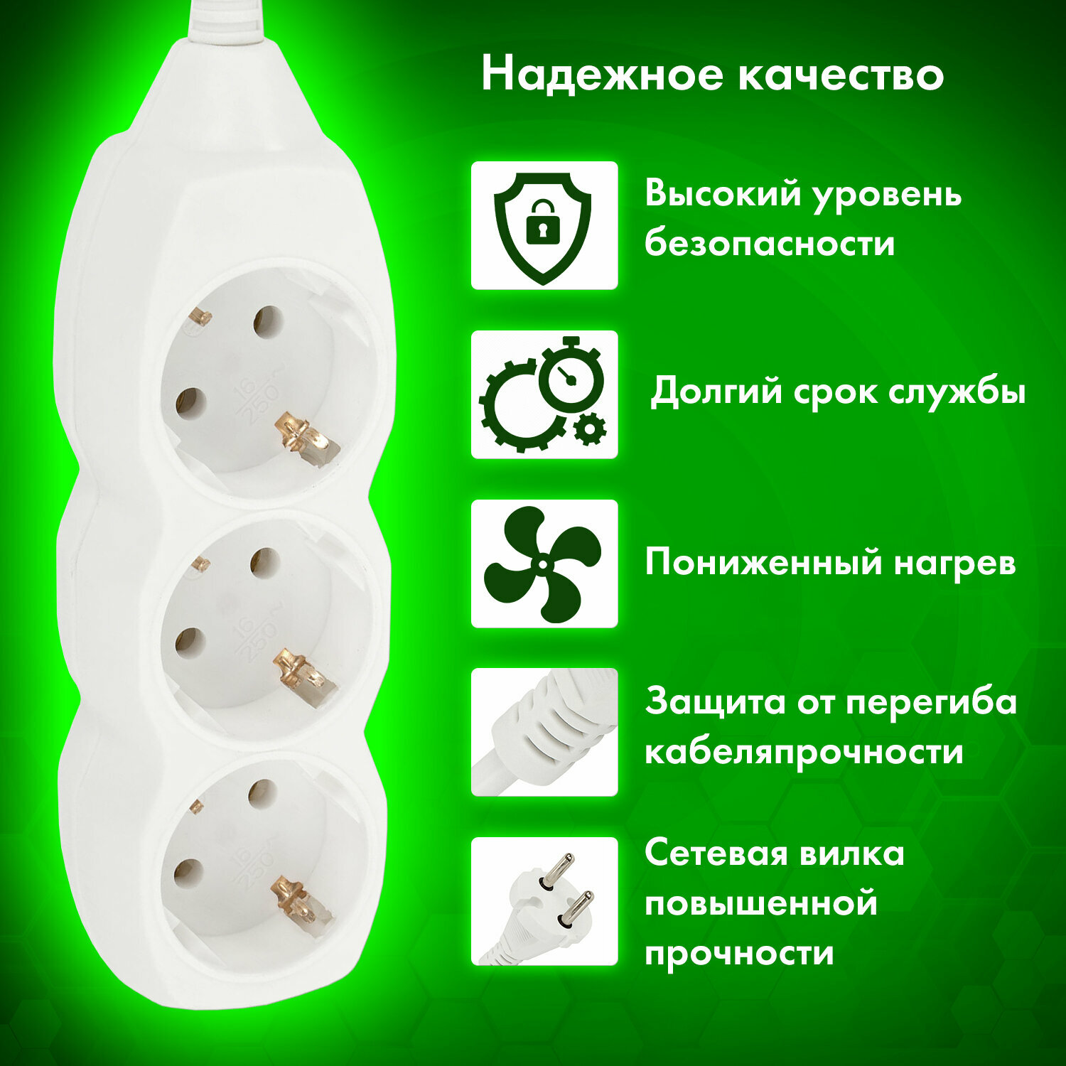 Удлинитель сетевой SONNEN U-135, 3 розетки, без заземления, 6 А, 5 м, белый, 511430, 511430