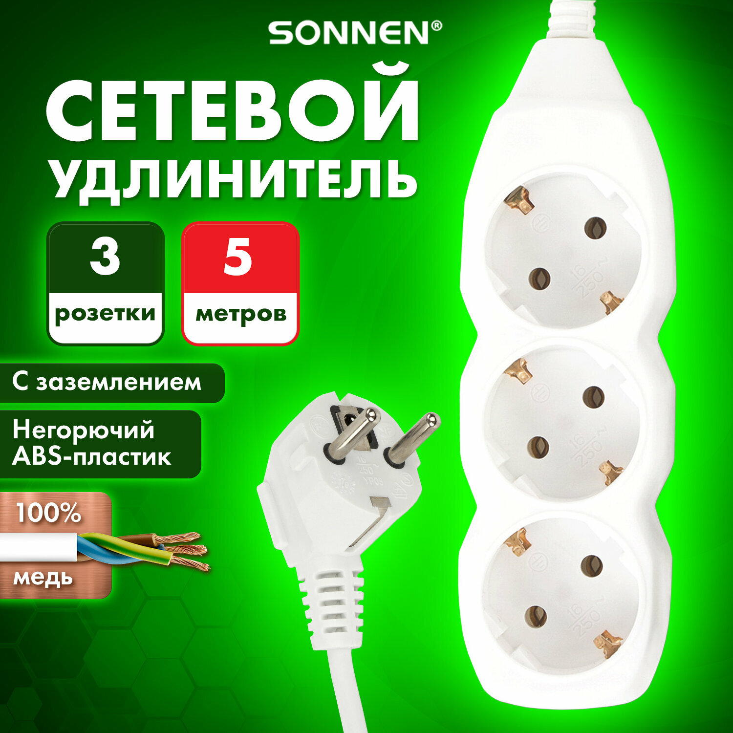Удлинитель сетевой SONNEN U-135, 3 розетки, без заземления, 6 А, 5 м, белый, 511430 (цена за 1 ед.товара)