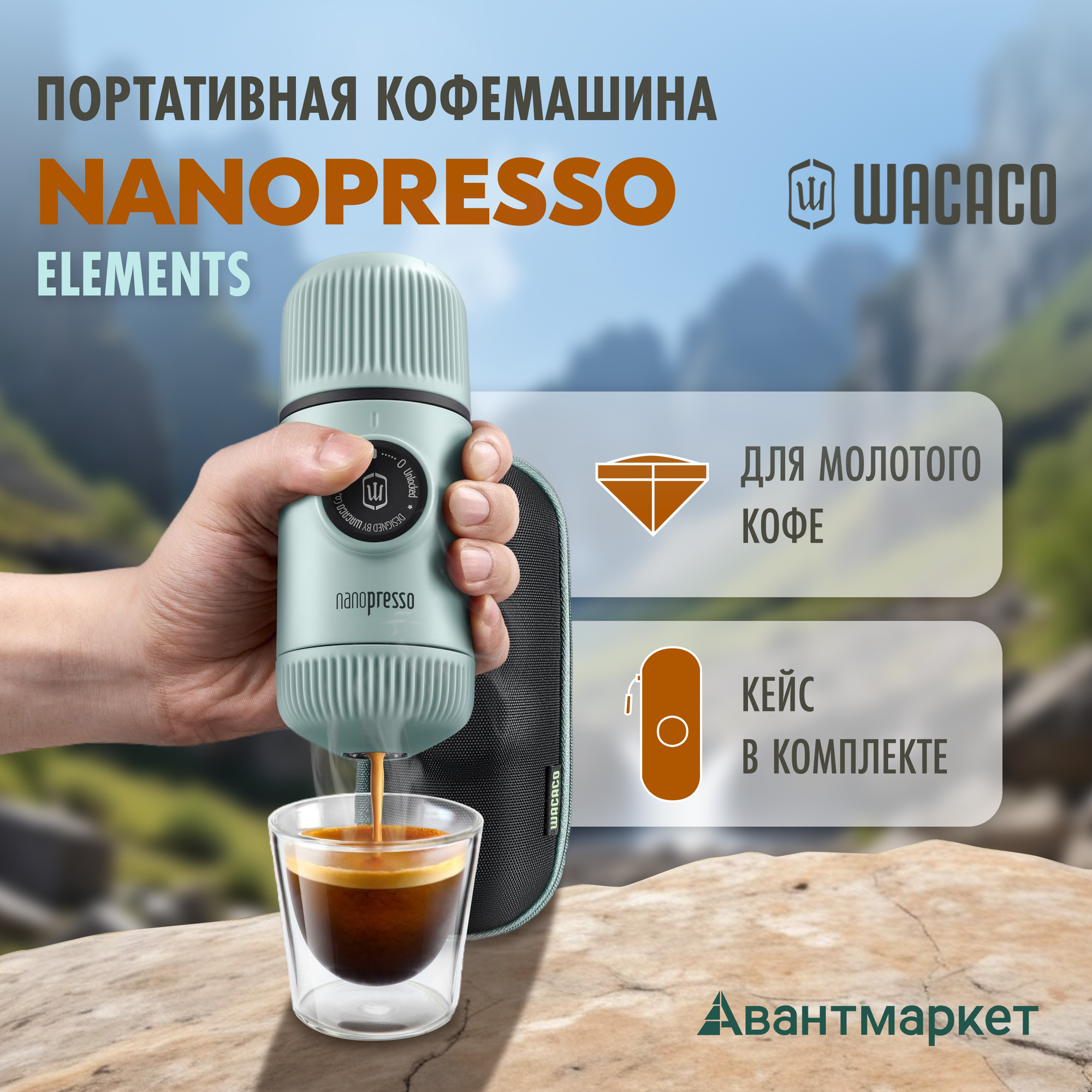Ручная портативная эспрессо кофемашина Wacaco Nanopresso Elements для молотого кофе с защитным кейсом для хранения, 18 бар, 80 мл., цвет зеленый, WCCMSGR
