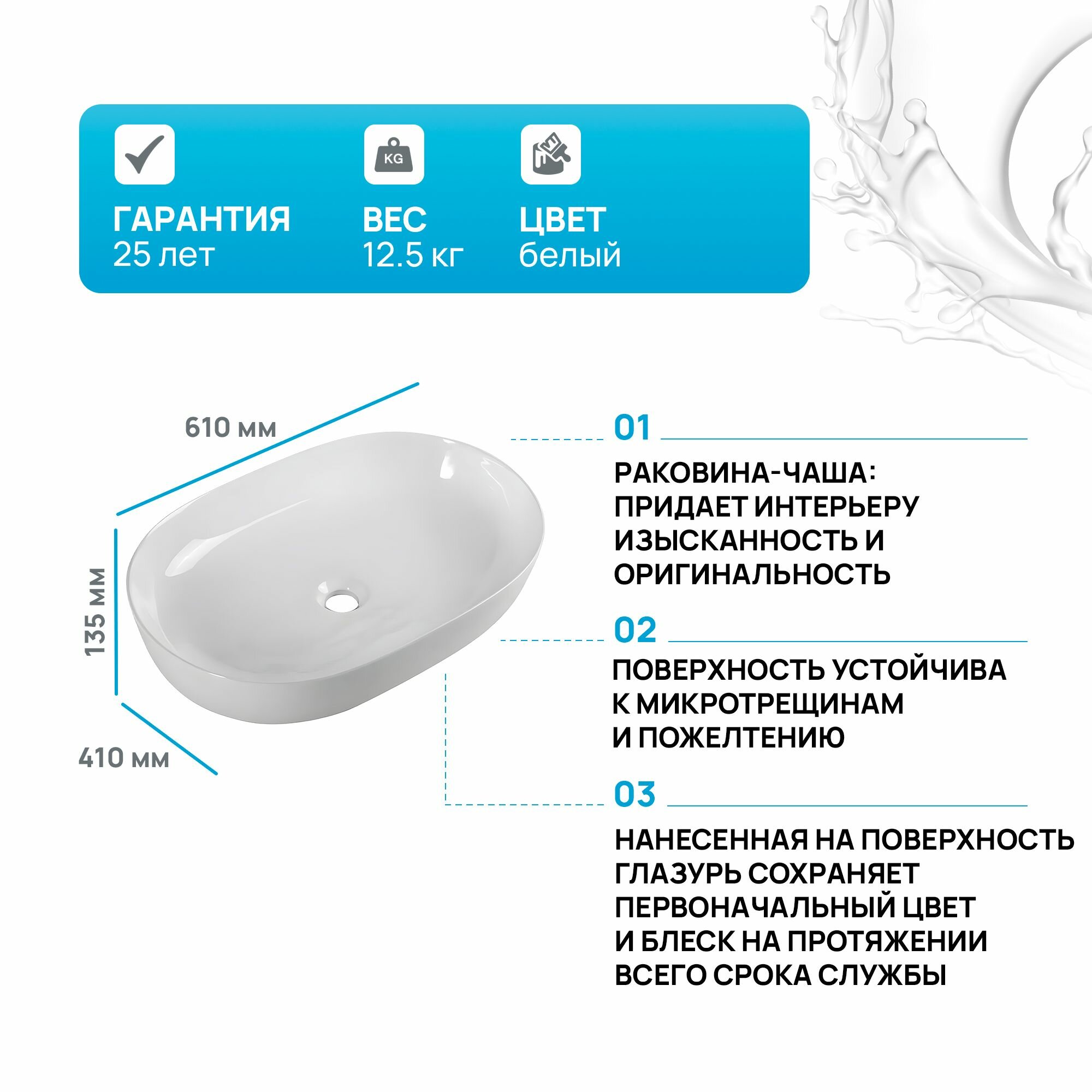 Раковина накладная BelBagno (610х410х135) овальная, без отверстия под смеситель, белая BB1348