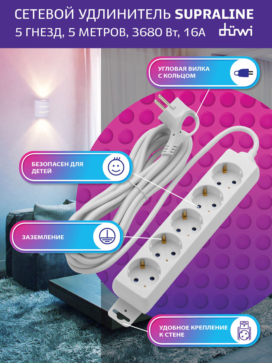 duwi Удлинитель с заземлением Supraline 5 розеток, 5 метров, 3х1,5мм2, 3680 Вт, 16А, 32061 6 .