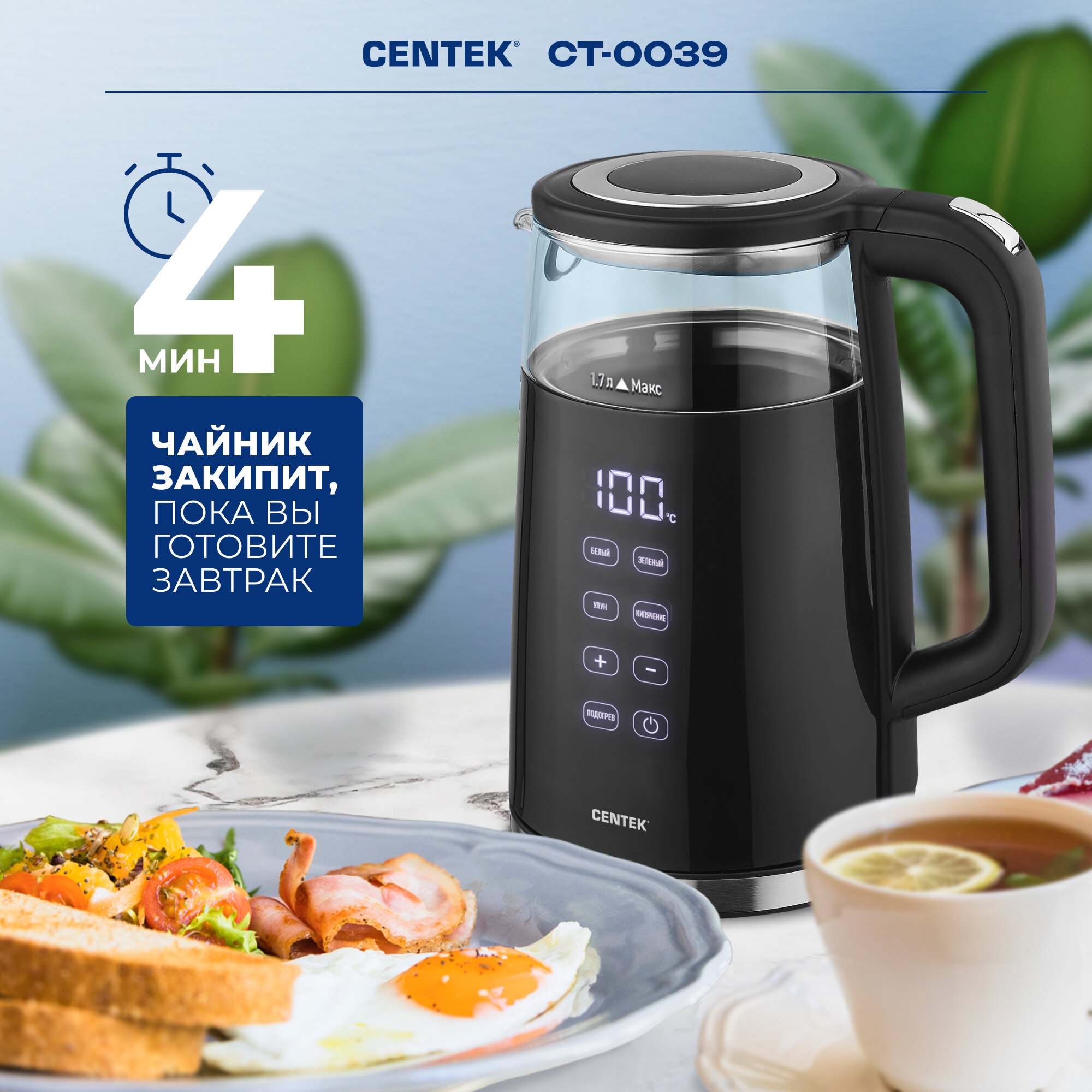 Умный чайник электрический CENTEK CT-0039: 2200Вт, 1.7л, LED-дисплей, с регулировкой температуры