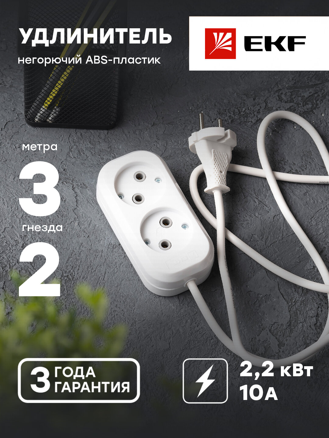 Удлинитель EKF Эксперт PROxima, 2 розетки, б/з, 10А / 2200 Вт белый 3 м