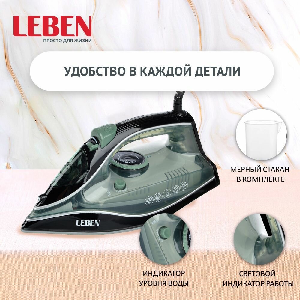 Утюг с отпаривателем 2000 Вт LEBEN, подошва - керамическое покрытие, система самоочистки, зеленый