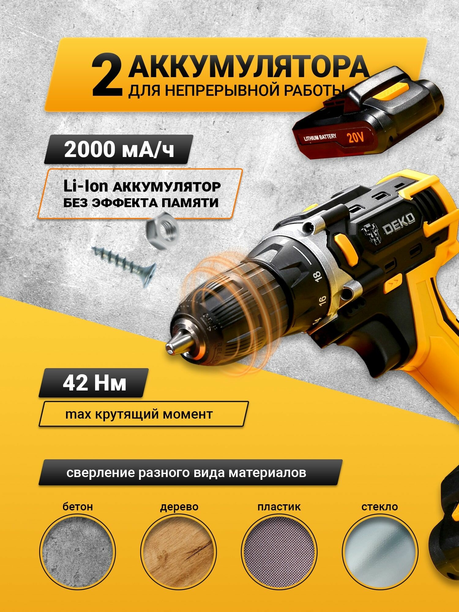Дрель-шуруповерт DEKO DKCD20FU-Li, 2Ач, с двумя аккумуляторами [063-4135]