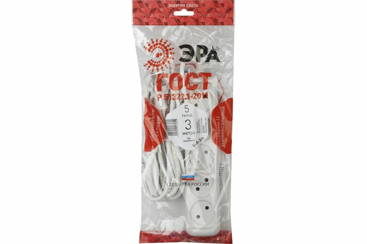 ЭРА U-3-5m Удлинитель без заземления., 3гн, 5м, ПВС, 2х1мм2, 10А