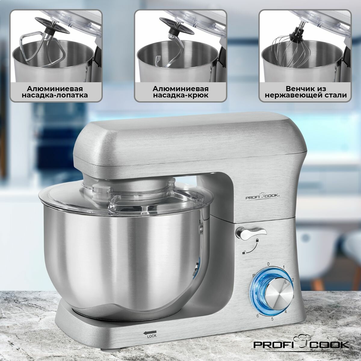 Купить Тестомес ProfiCook PC-KM 1188 с корпусом из цельного алюминия, литым под давлением, мощный профессиональный двигатель с длительным сроком службы, 1500 Вт, 8 уровней скорости, чаша из нержавеющей стали объемом 6 л, схема безопасности, серебристый цвет