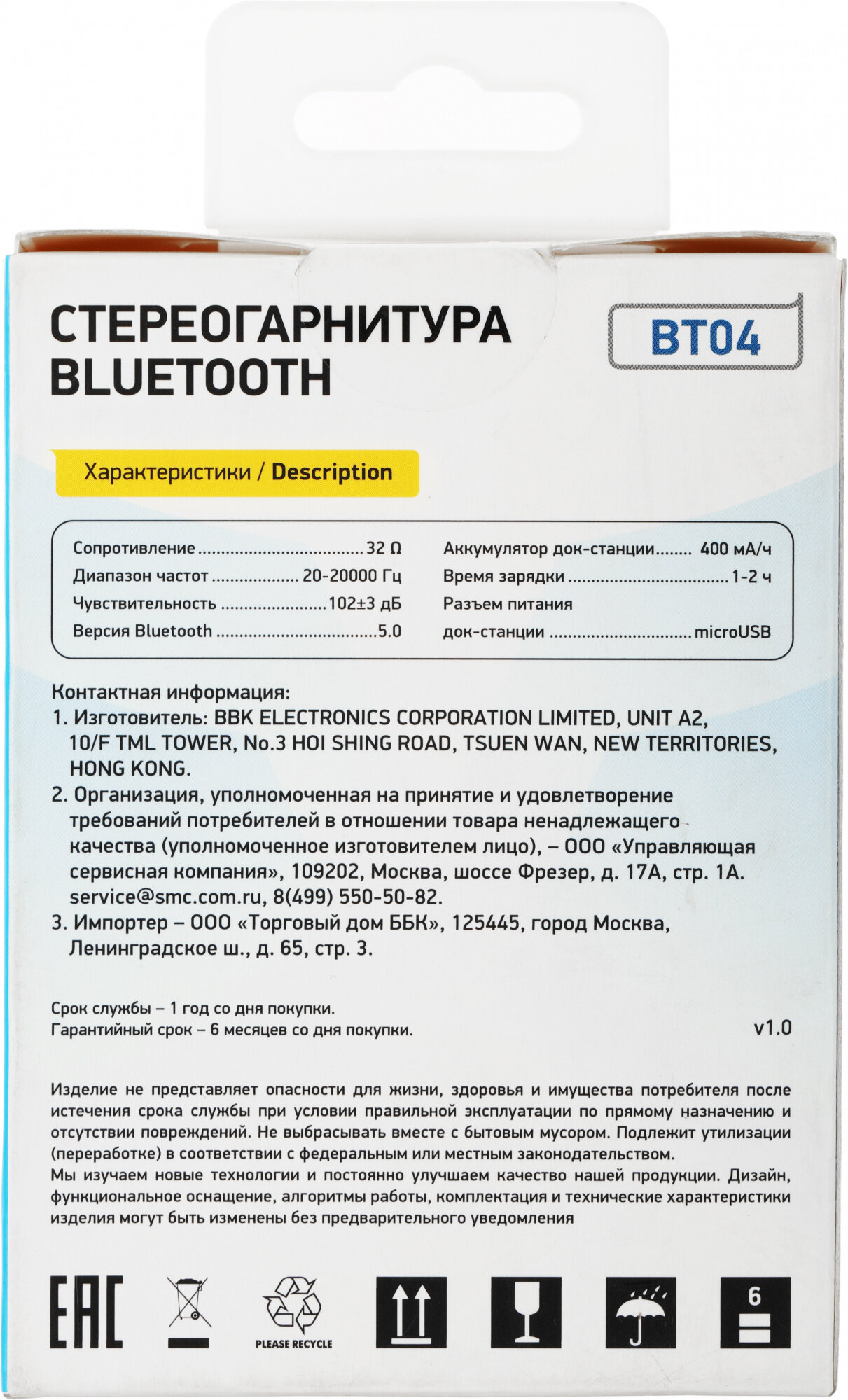 Ниже Вы можете прочитать отзывы на Наушники BBK BT04, Bluetooth, внутриканальные, белый [bt04 (w)], ознакомится с подробными характеристиками, посмотреть интересные обзоры и фотографии на Наушники BBK BT04, Bluetooth, внутриканальные, белый [bt04 (w)].