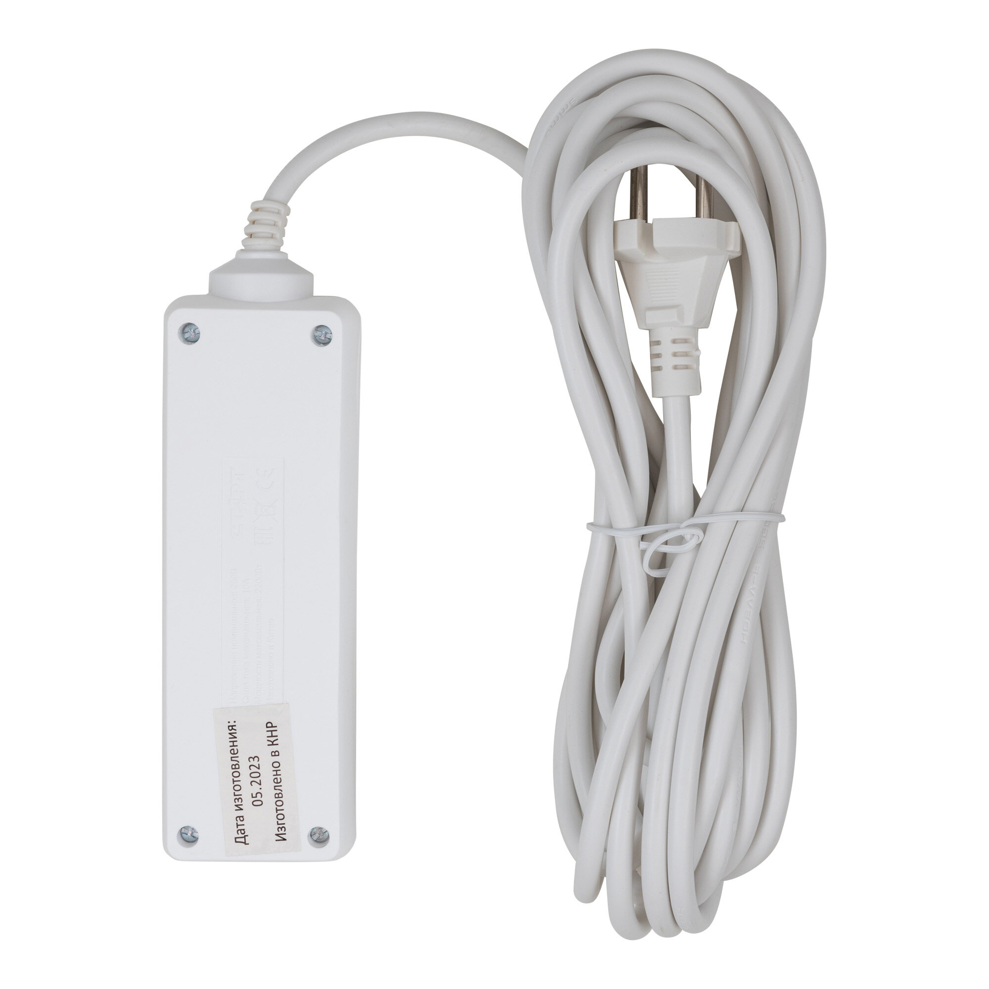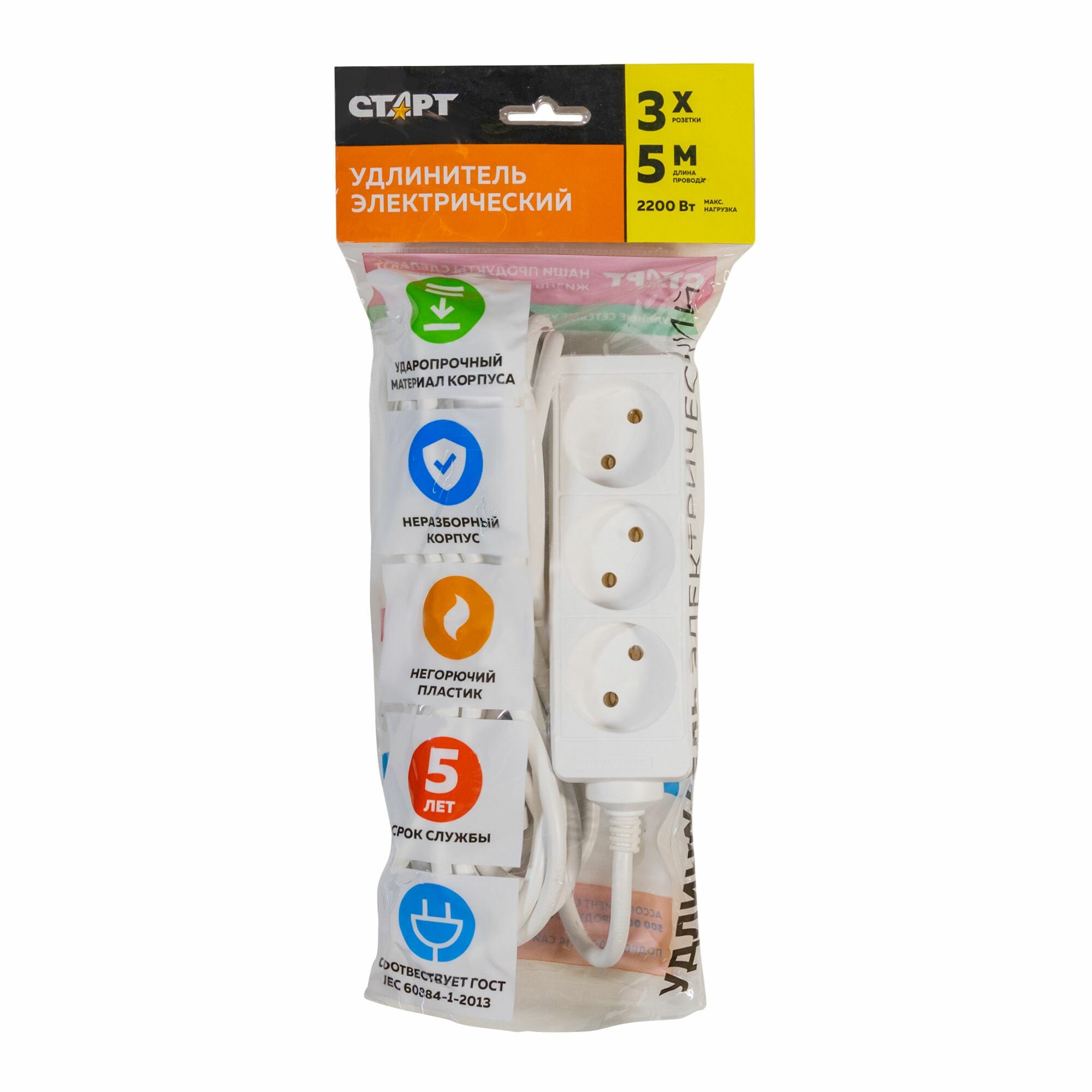 Удлинитель сетевой бытовой с заземлением 5м старт 5 розеток, 10А, ПВС 3х0.75, 2200 Вт