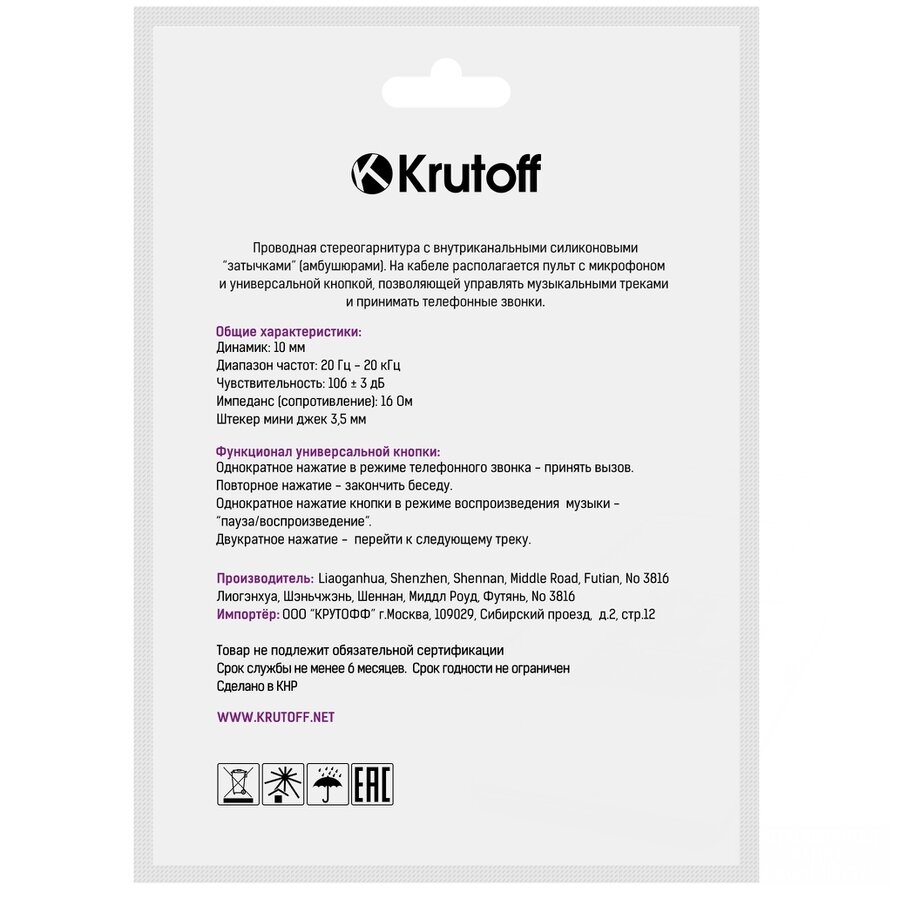 Наушники Krutoff HF-J69, вакуумные, микрофон, 106 дБ, 16 Ом, 3.5 мм, 1 м, коробка, черные