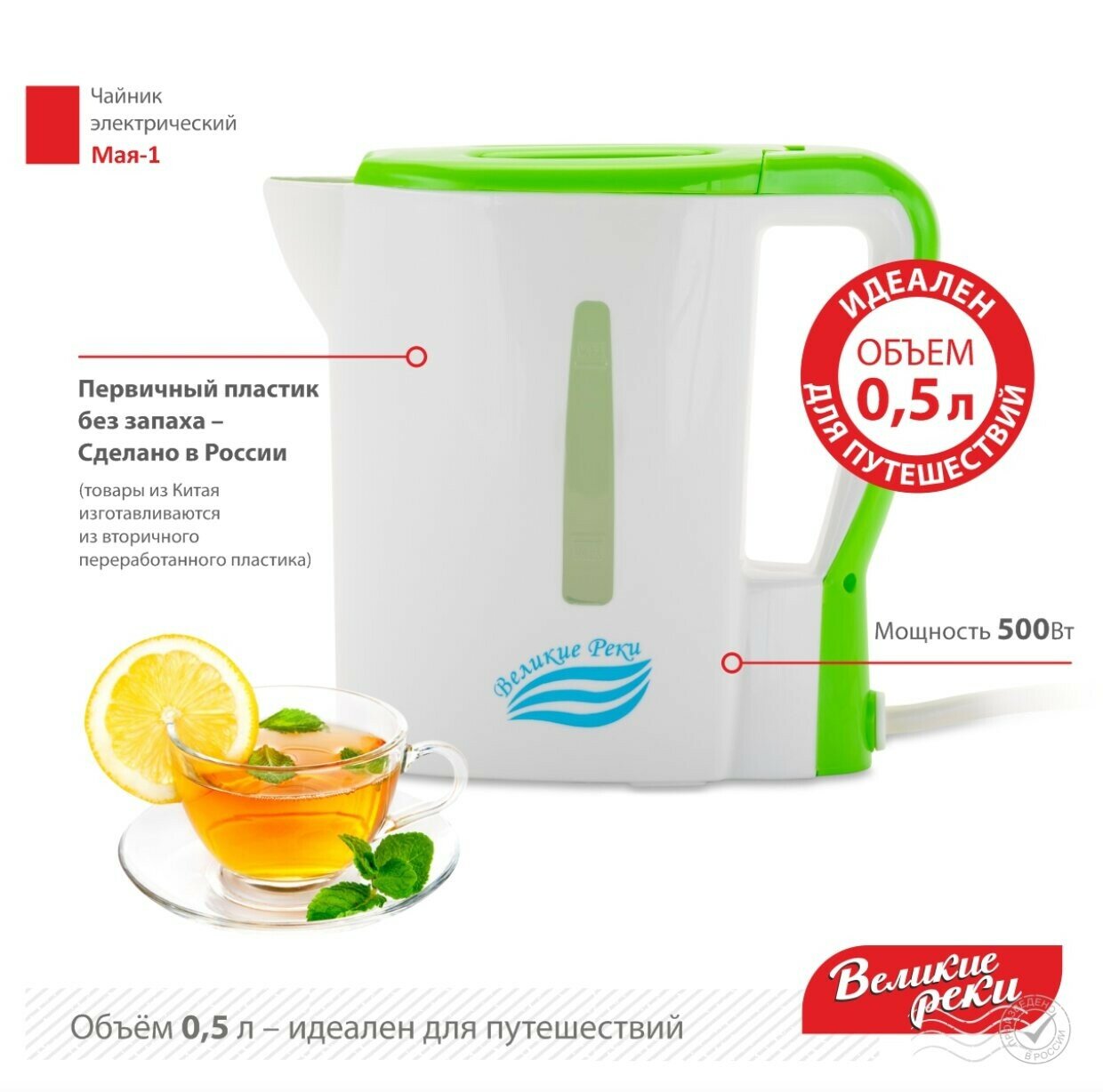 Купить Чайник электрический Великие Реки Мая-1 0,5л, пластик, бело-салатовый, 500Вт