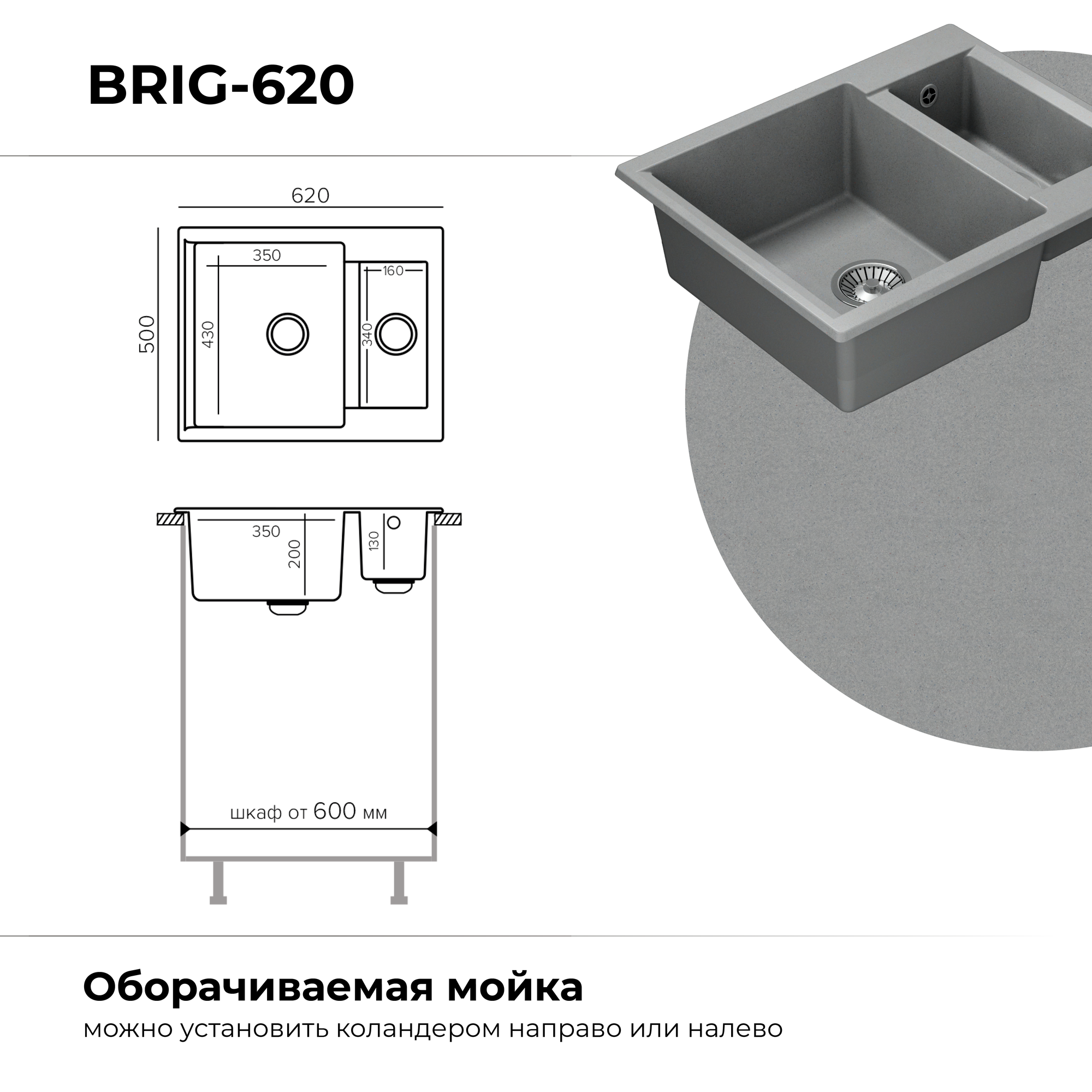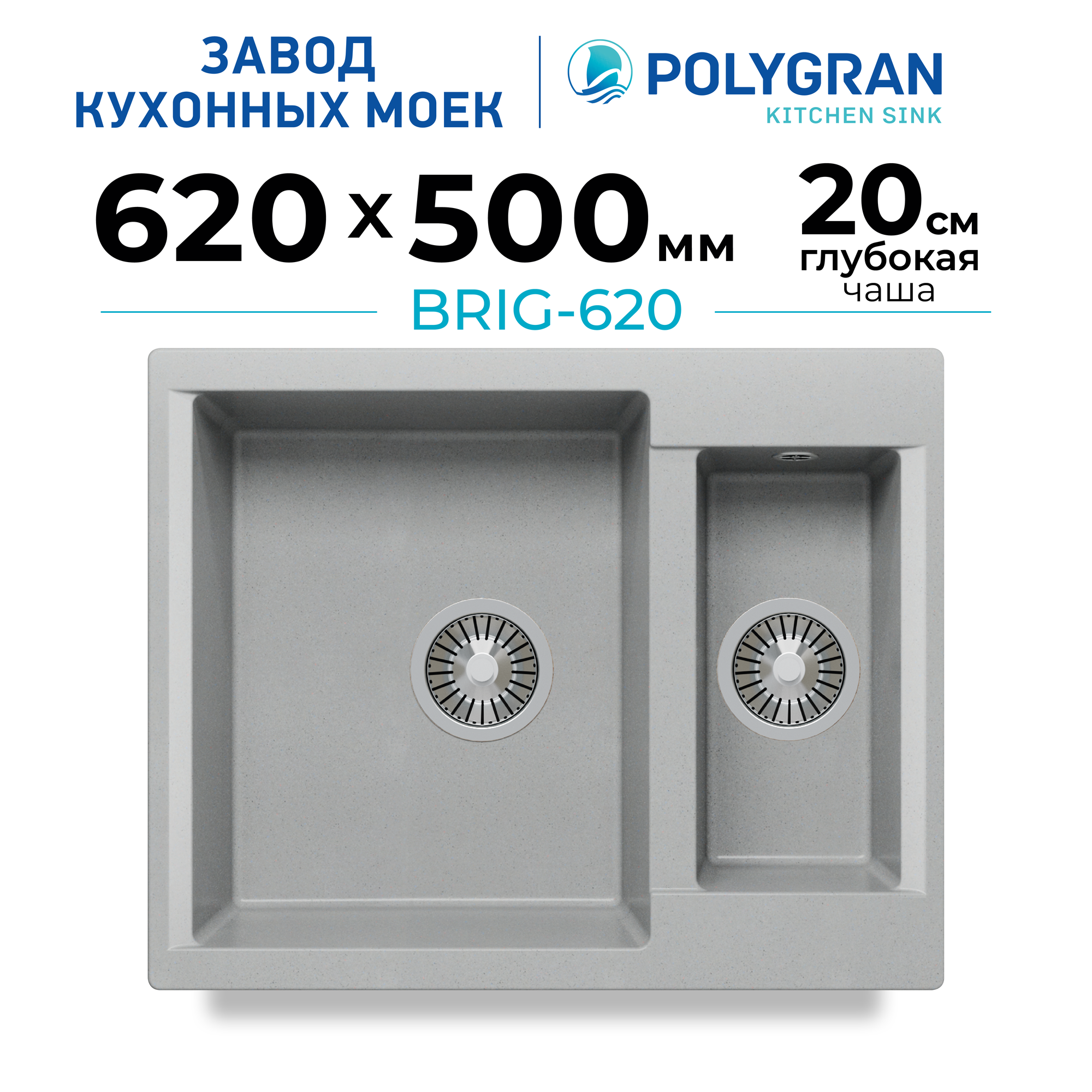 СохранитьМойка для кухни POLYGRAN Brig-620 врезная, каменная, с дополнительной чашей (№14 Серый) интересное: