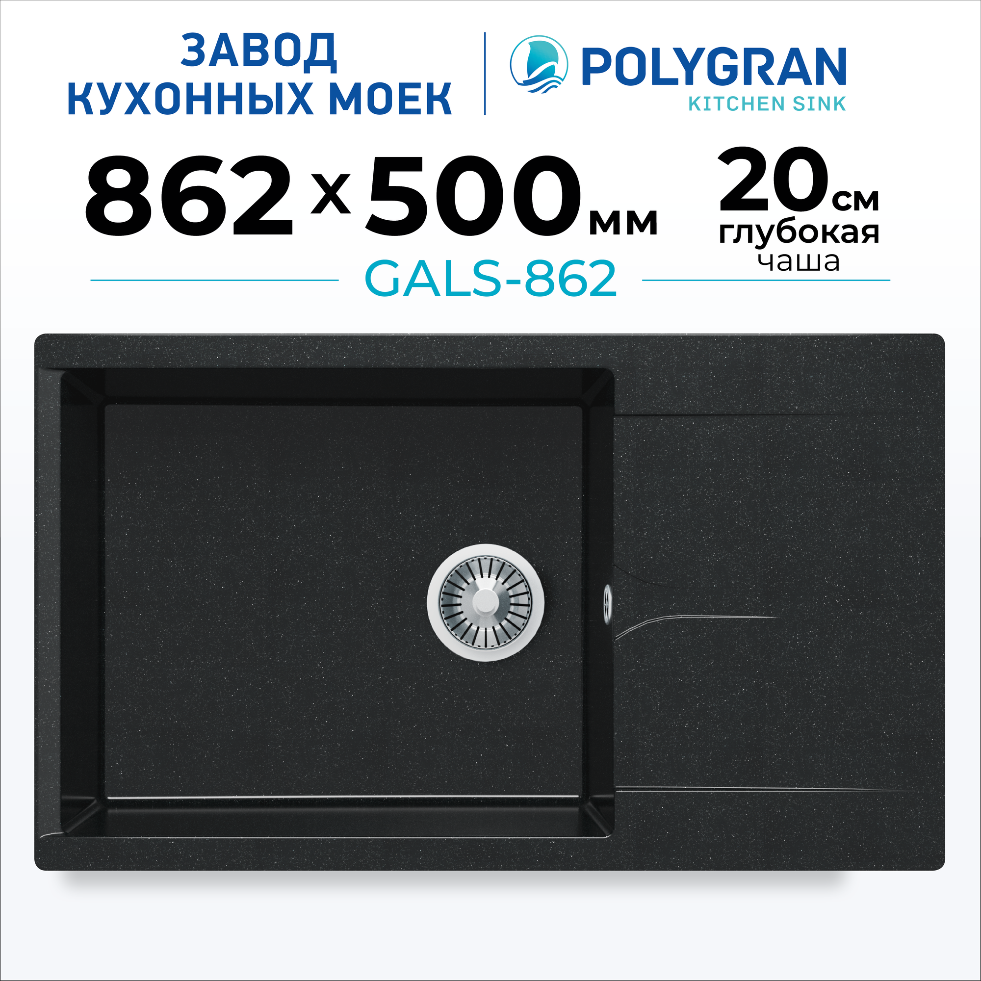 Мойка для кухни POLYGRAN Gals-862 каменная с удлиненным крылом (№16 Черный)