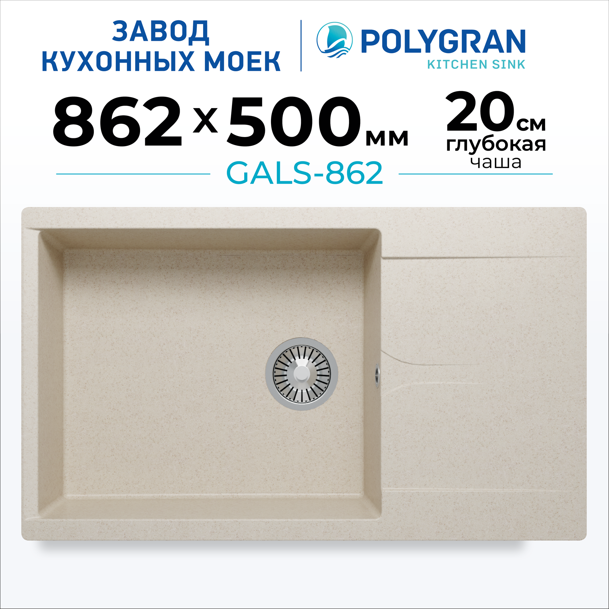 Мойка для кухни POLYGRAN Gals-862 каменная с удлиненным крылом (№327 Кремовый)