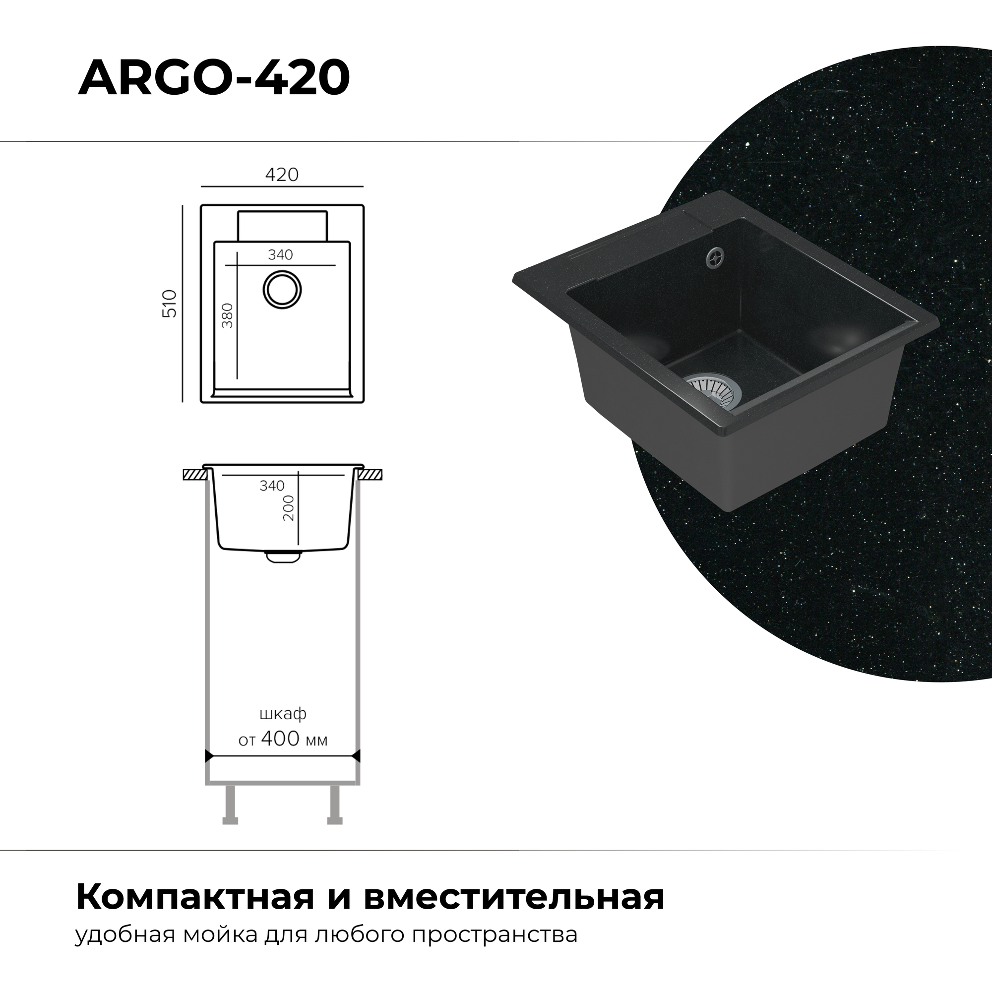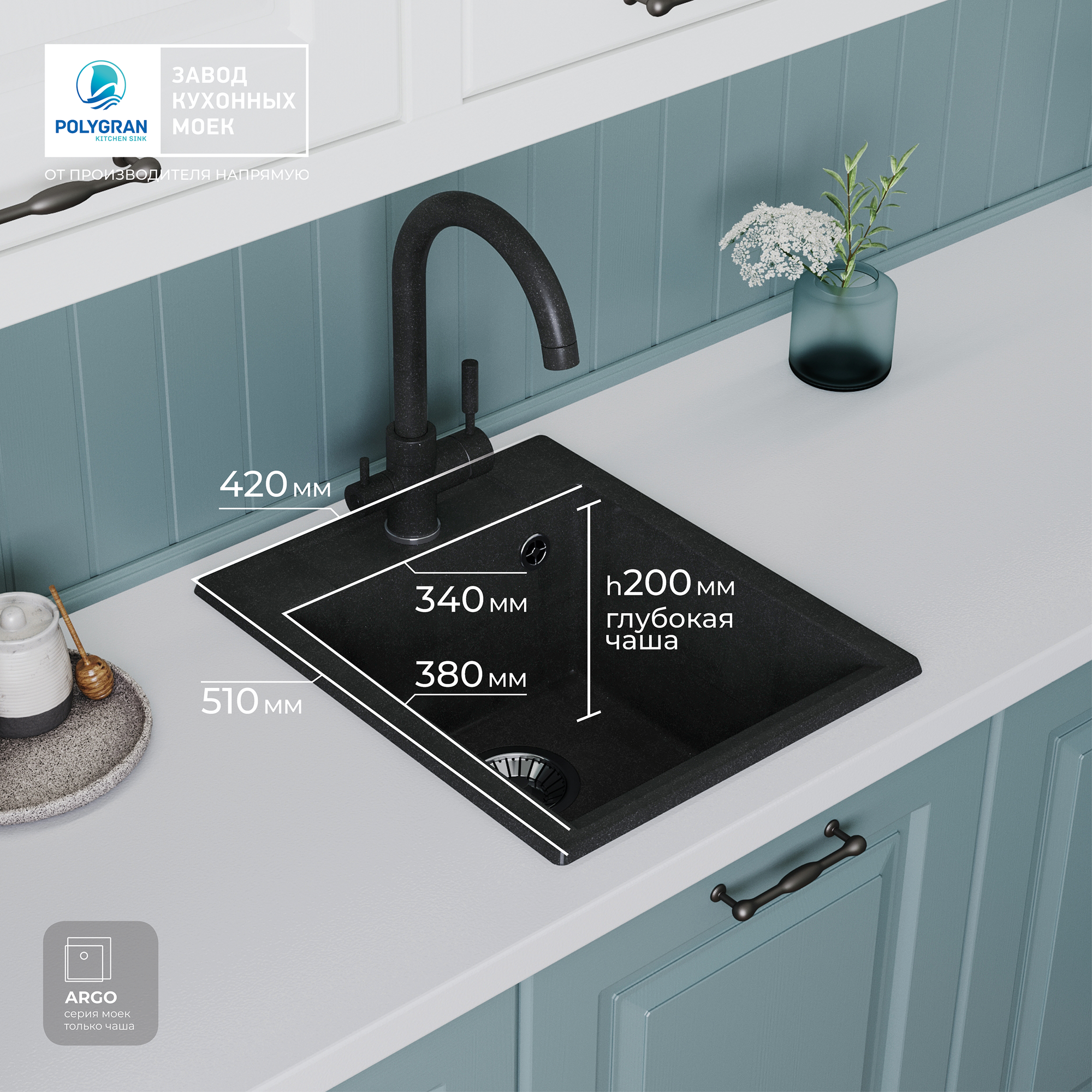Врезная кухонная мойка 42 см, Polygran Argo-420, матовое черный 16