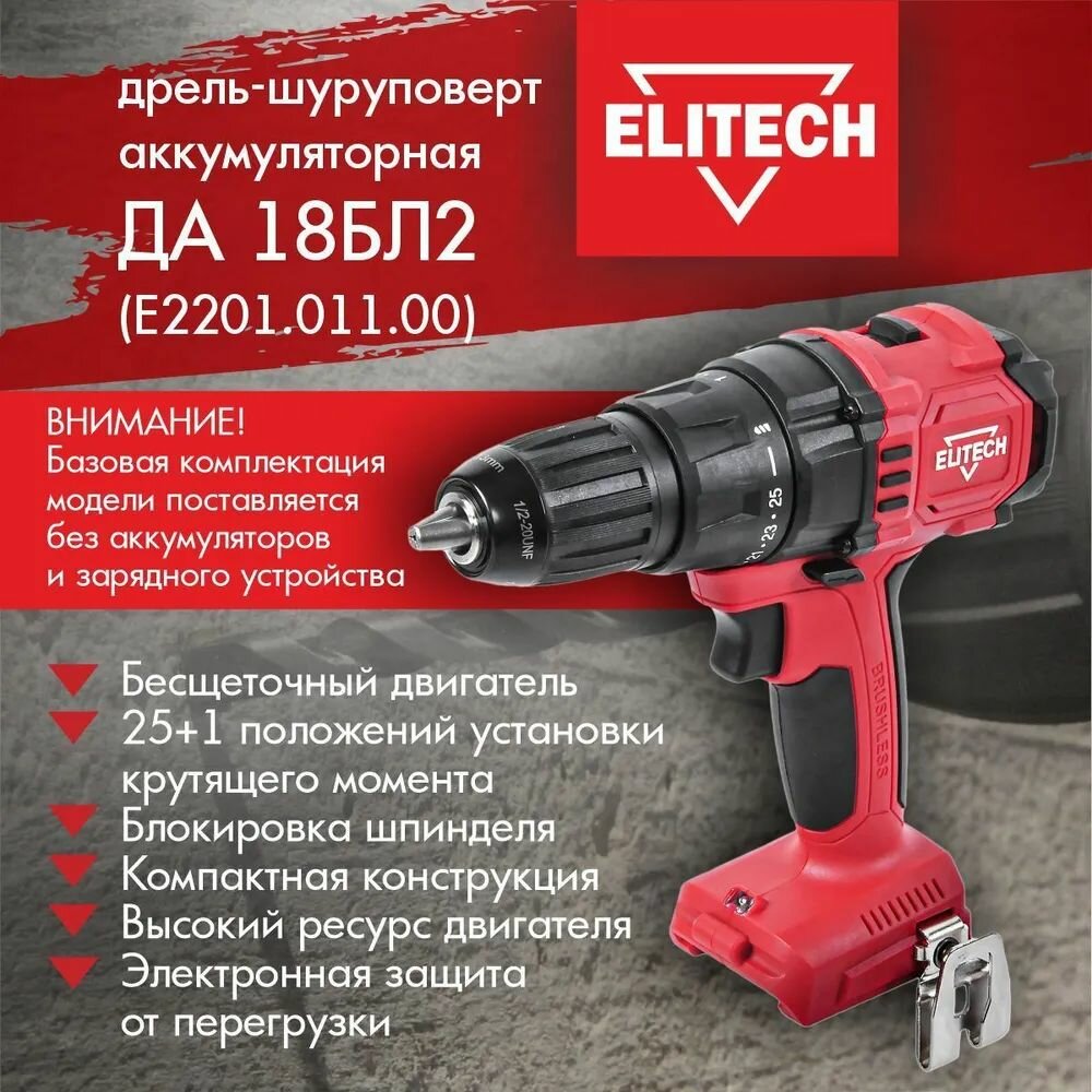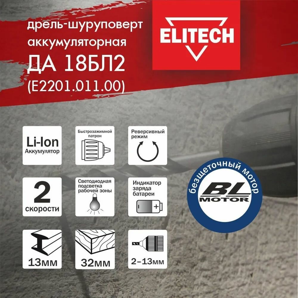 Аккумуляторная дрель-шуруповерт бесщеточная Elitech ДА 18БЛ2 ( E2201.011.00)
