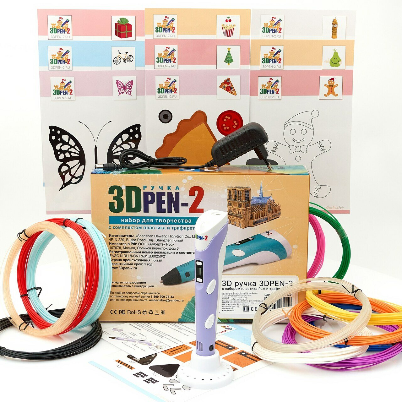 Купить 3D ручка 3DPEN-2 (цвет: фиолетовый) с набором пластика PLA 12 цветов по 10 метров и набором трафаретов для 3D ручек