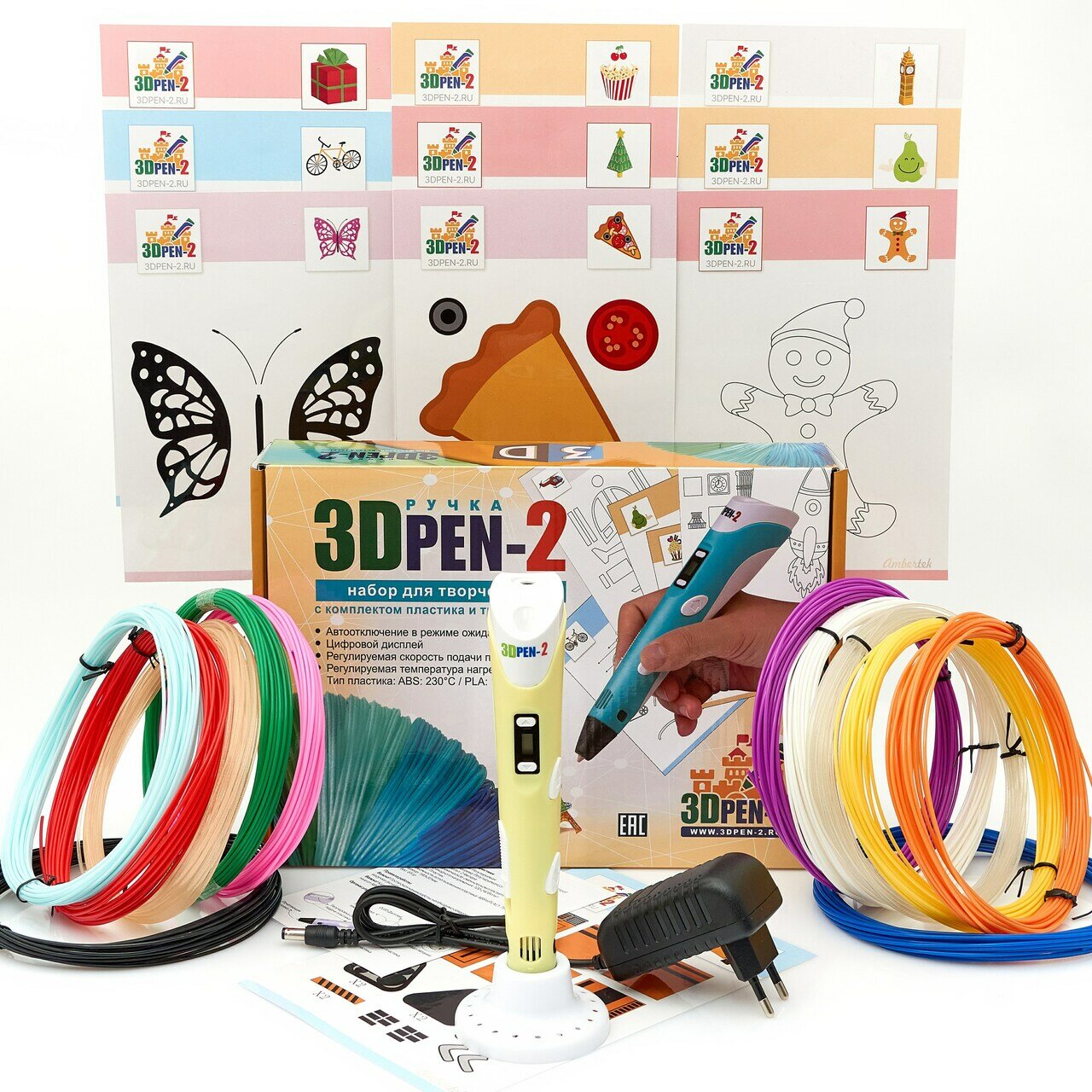 Купить 3D ручка 3DPEN-2 (цвет: желтый) с набором пластика PLA 12 цветов по 10 метров и набором трафаретов для 3D ручек