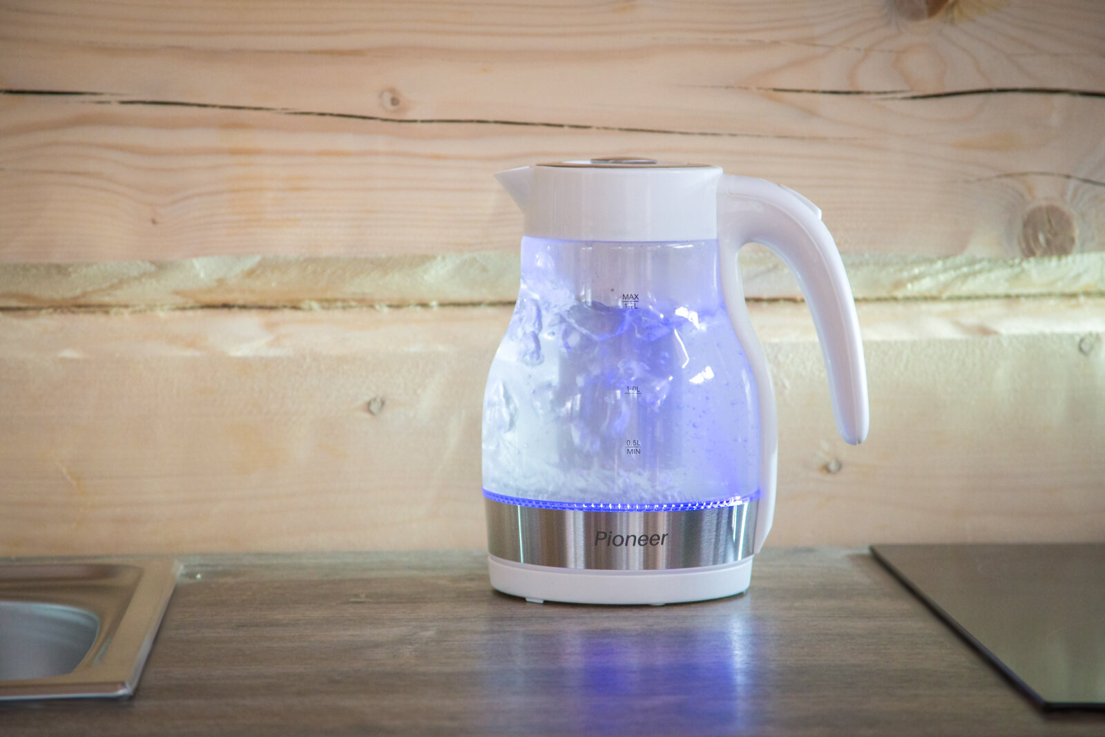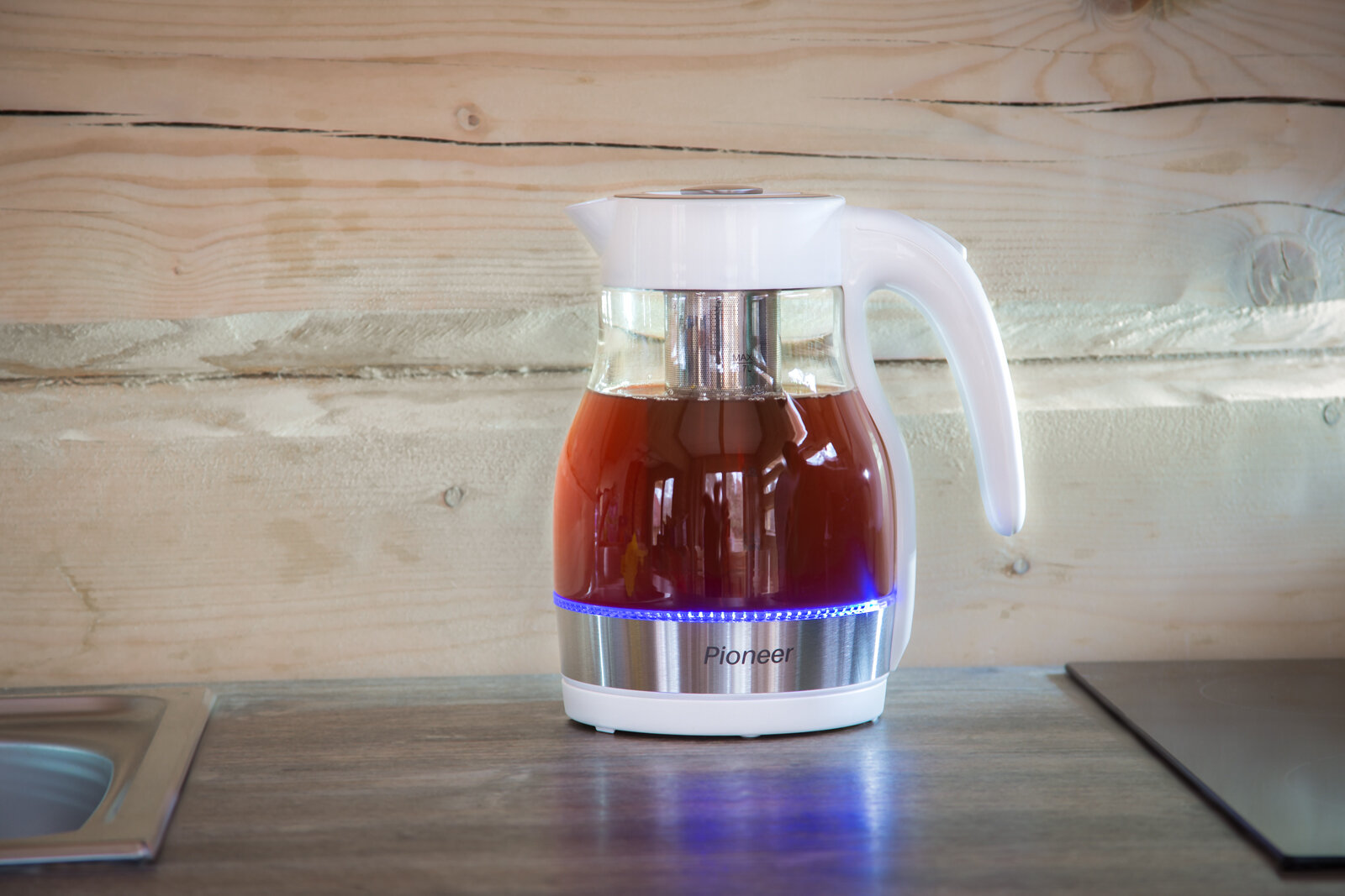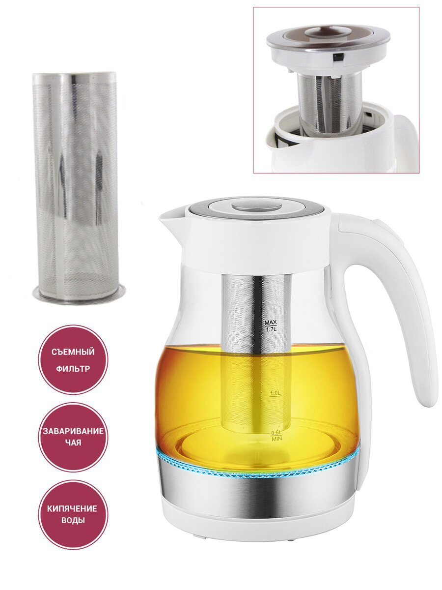 Электрический чайник Pioneer KE802G white, 2 в 1 из боросиликатного стекла со съемным заварочным фильтром, LED подсветка, съемная крышка, 1,7 л, 2200 Вт