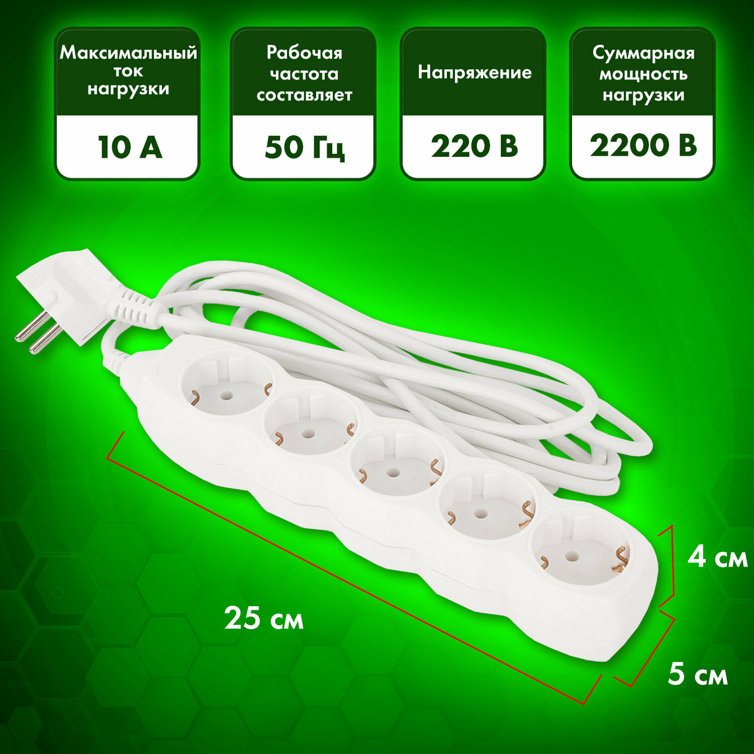 Удлинитель сетевой SONNEN U-155G, 5 розеток, c заземлением, 10 А, 5 м, белый, 511437, 511437