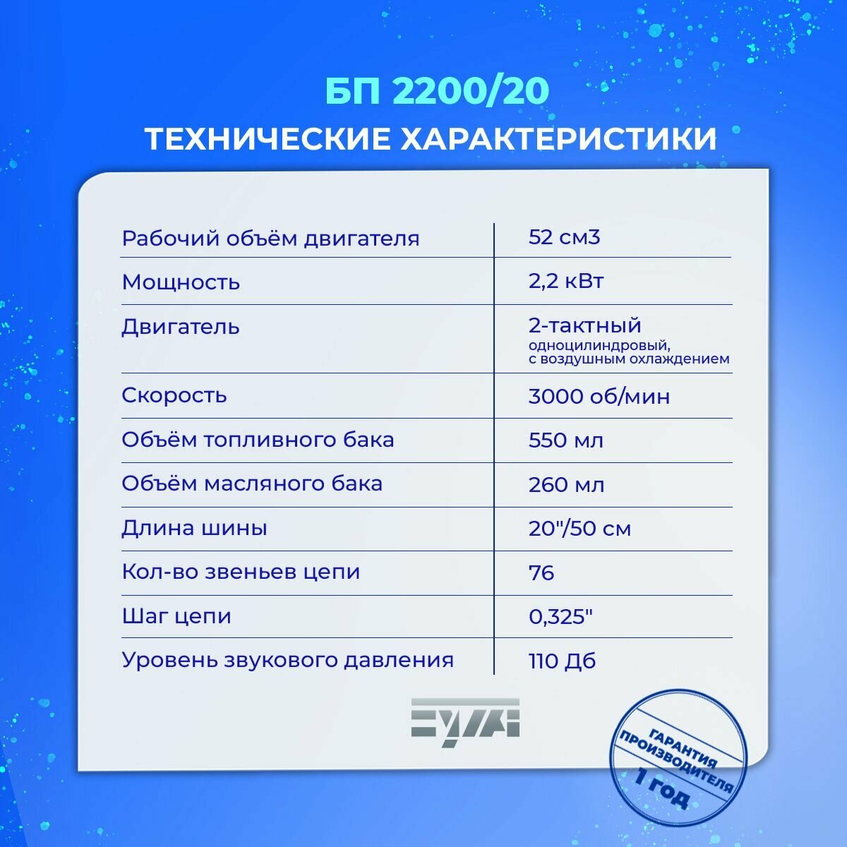 СохранитьБензопила цепная бензиновая БП 2200/20 мощность 2,2 кВт. (2200 Вт.) шина 50 см., двигатель 52 см3. интересное: