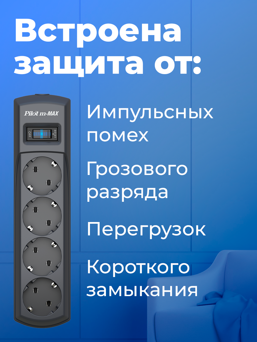 Сетевой фильтр PILOT m MAX (4/1.8м/16А/150Дж/темн.серый) интересное: