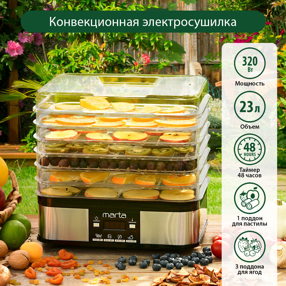 Сушилка для овощей и фруктов MARTA MT-1885 6 уровней + 1 поддон для пастилы + 3 для ягод с электронным контролем температуры, черный жемчуг