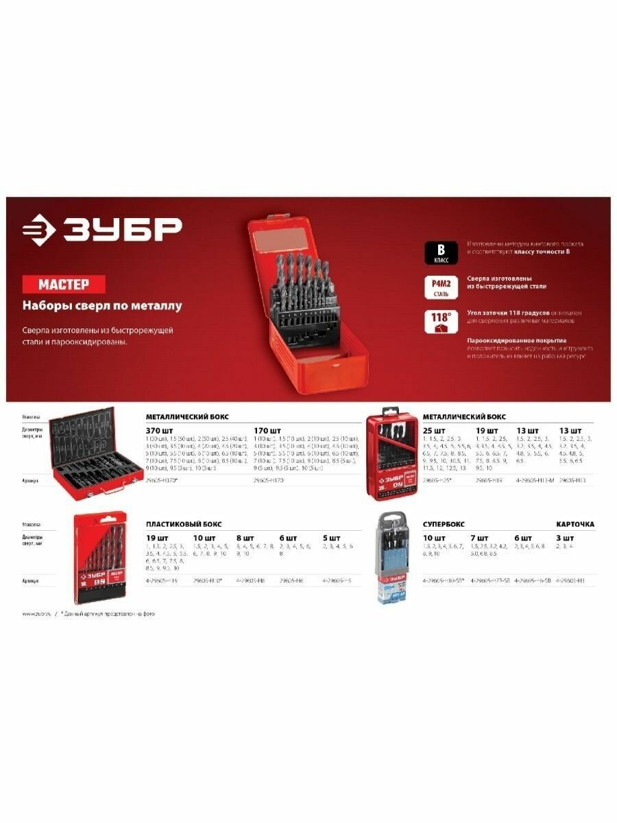 ЗУБР мастер 370шт(1-10мм), Набор сверл по металлу, сталь Р4М2, класс В, мет.бокс(29605-H370)