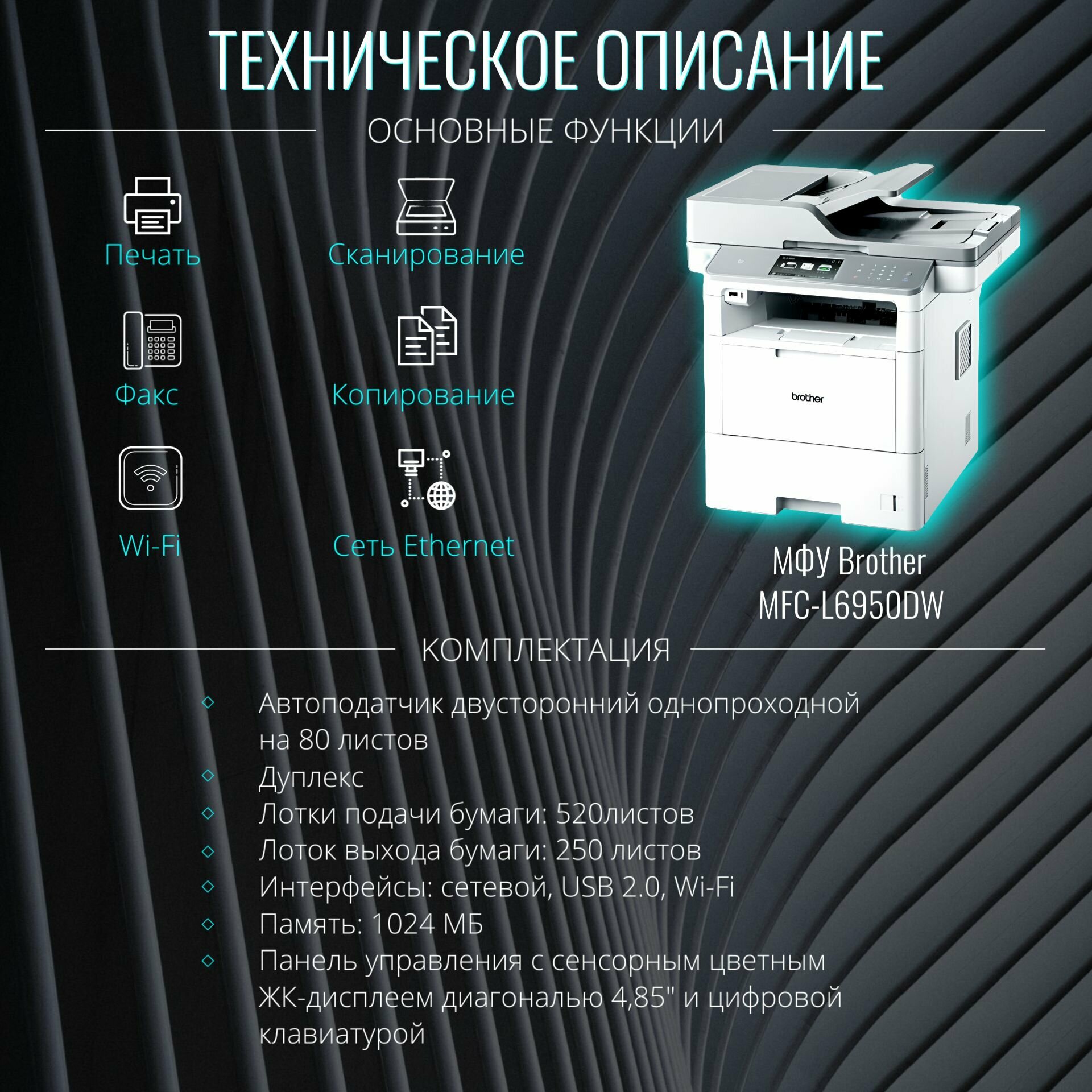 МФУ монохромное Brother MFCL6950DW A4, 1Гб, 50стр/мин, PCL, факс, дуплекс, SPDF80, GigaLAN, WiFi, NFC, 1 лоток на 520л, стартовый картридж 20000стр.