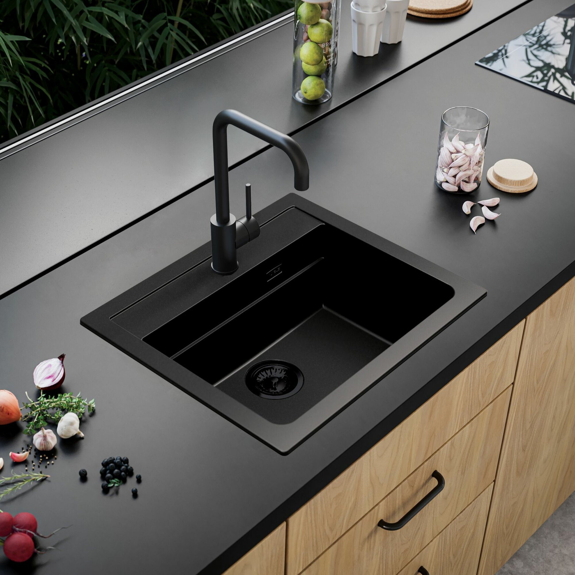 Раковина для кухни врезная каменная Alveus Granital Atrox 30 CARBON - G91 59 X 50 см / кухонная мойка накладная из искусственного камня, гранит, черный