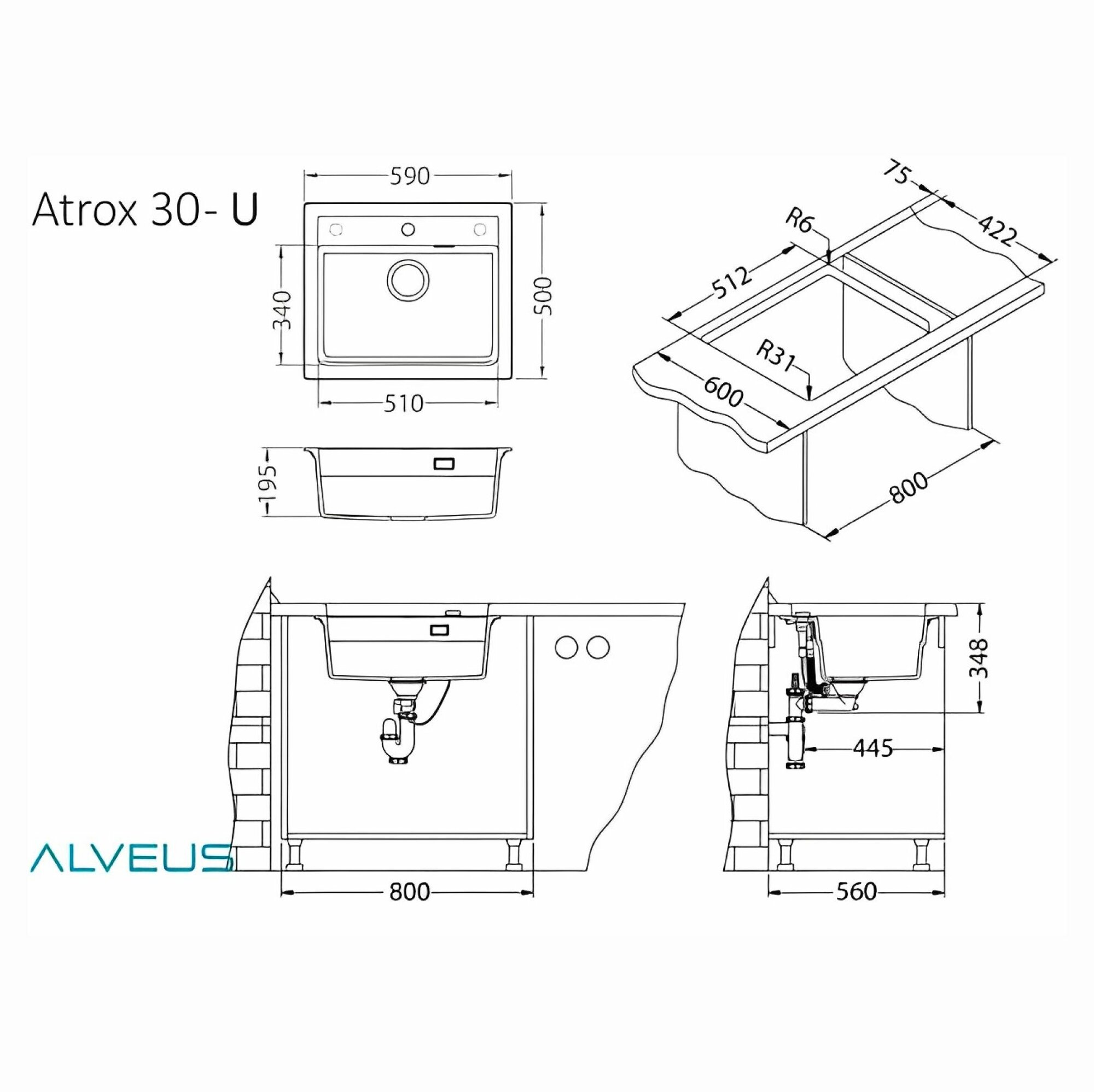 Кухонная мойка ALVEUS GRANITAL ATROX 30 CARBON - G91 590 X 500 черный (1131996)
