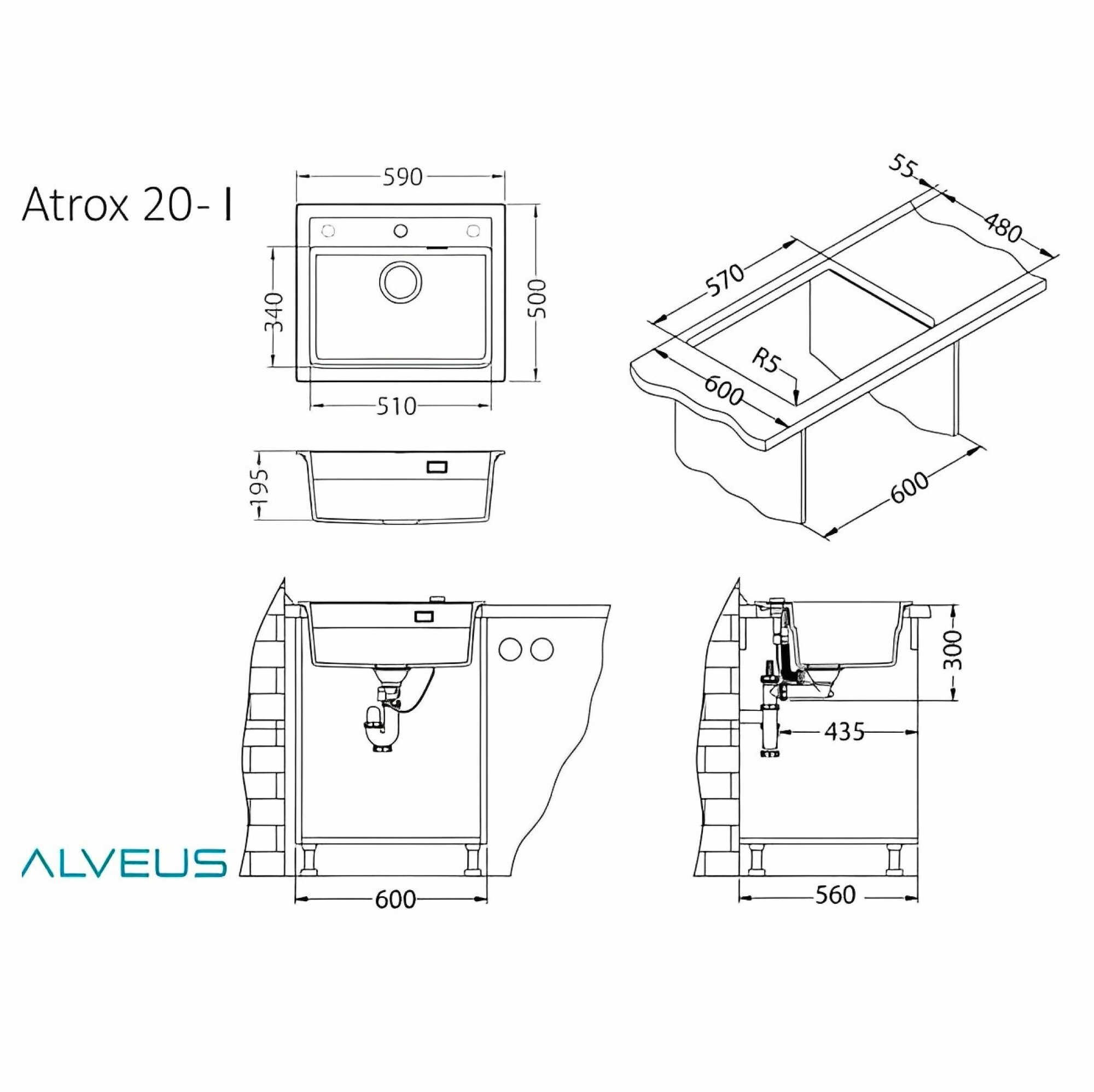 Мойка ALVEUS GRANITAL ATROX 30 CONCRETE - G81 590 X 500 1X в комплекте с сифоном 1132823, Alveus серый