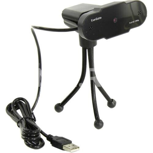 Веб-камера ExeGate BlackView C615 FullHD Tripod (матрица 1/3" 2 Мп, 1920х1080, 1080P, 30fps, 4-линзовый объектив, шторка, USB, фиксированный фокус, микрофон с шумоподавлением, универсальное крепление, штатив Flex в комплекте, кабель 1,5 м, Win Vista/7/8/1