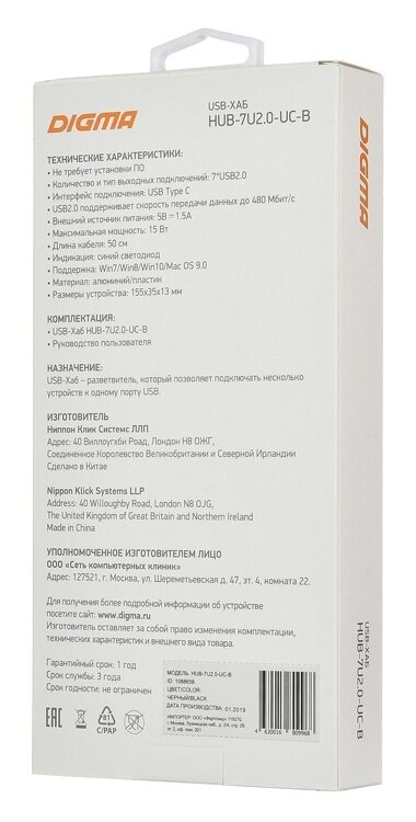 Концентратор Digma HUB-7U2.0-UC-B интересное: