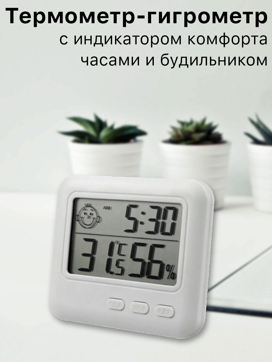 Купить Термометр-гигрометр с часами, будильником индикатором уровня комфорта