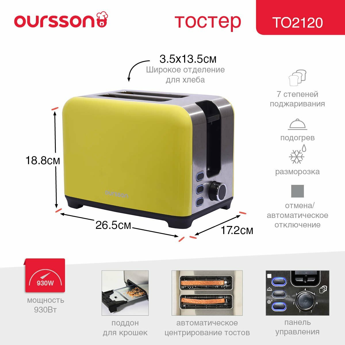 Купить Тостер Oursson TO2120/GA зеленый, 930 Вт, тостов - 2, подогрев, размораживание