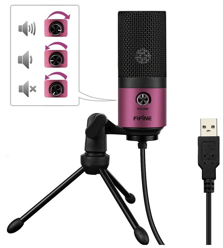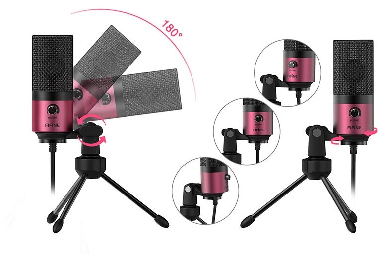 Микрофон FIFINE K669 (розовый, на штативе, USB 5V, 20Hz-20kHz, -34dB±30% (1kHz), S/N 78dB, шнур 1.8 м, рег. громкости)