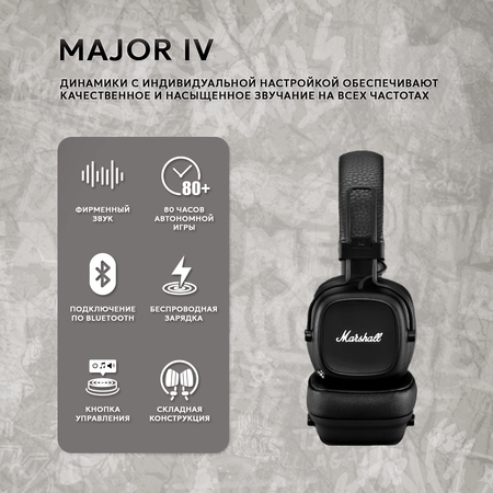 Marshall Major IV Black, Беспроводные наушники, Bluetooth 5.0, 20-20000 Гц, 32 Ом, AAC, чёрные