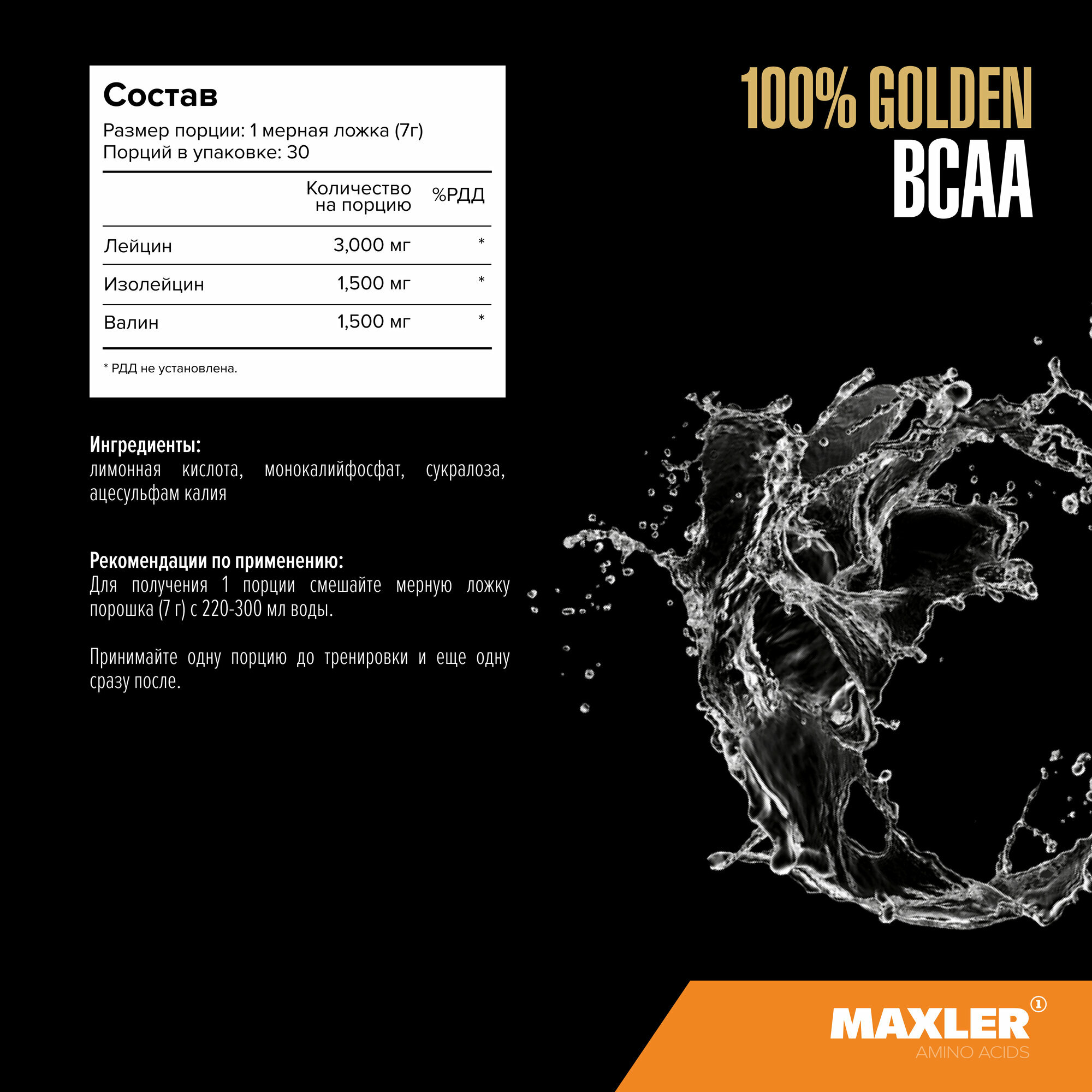 Аминокислоты Maxler 100% Golden BCAA - Апельсин, 210г - БЦАА в соотношении 2:1:1 - В форме порошка - 30 порций